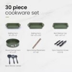 Kitchen Cookware & Bakeware Set 30 Piece – Include 5.5-inch fry pan / 8-inch fry pan / 11-inch fry pan / 9.5-inch deep fry pan with lid / 9.5-inch square steak fry pan / 1.5qt saucepan with lid / 3qt casserole with lid / 5qt casserole with lid / 5qt steamer / Baking form:14″x9.2″x2.2″ / Baking form:11.6″x6″x2.5″ / Rect baking tray 14.6″x9.8″x2.2″ / Round spring form 10″x2.5″ / 12 cup muffin pan:16″x10″x1.3″ / 3 pcs silicone utensils / 3pcs ceramic knives / 6 pcs dining placemat