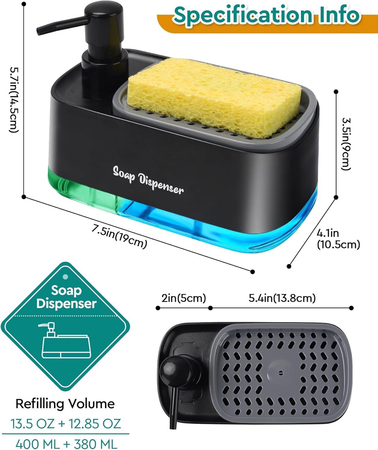 Multifunctional 3-in-1 Design: This soap dispenser and sponge holder with two independent soap bottles, making it convenient to store hand soap and dishwashing liquid simultaneously. Additionally, it comes with a handy sponge rack for easy sponge placement. This clever design not only enhances kitchen cleaning efficiency but also effectively saves countertop space.