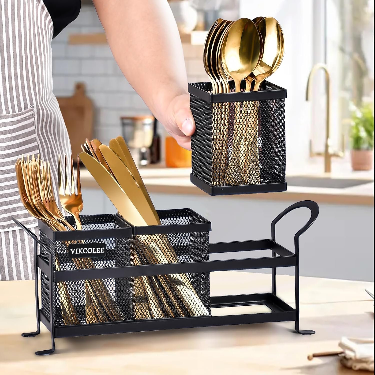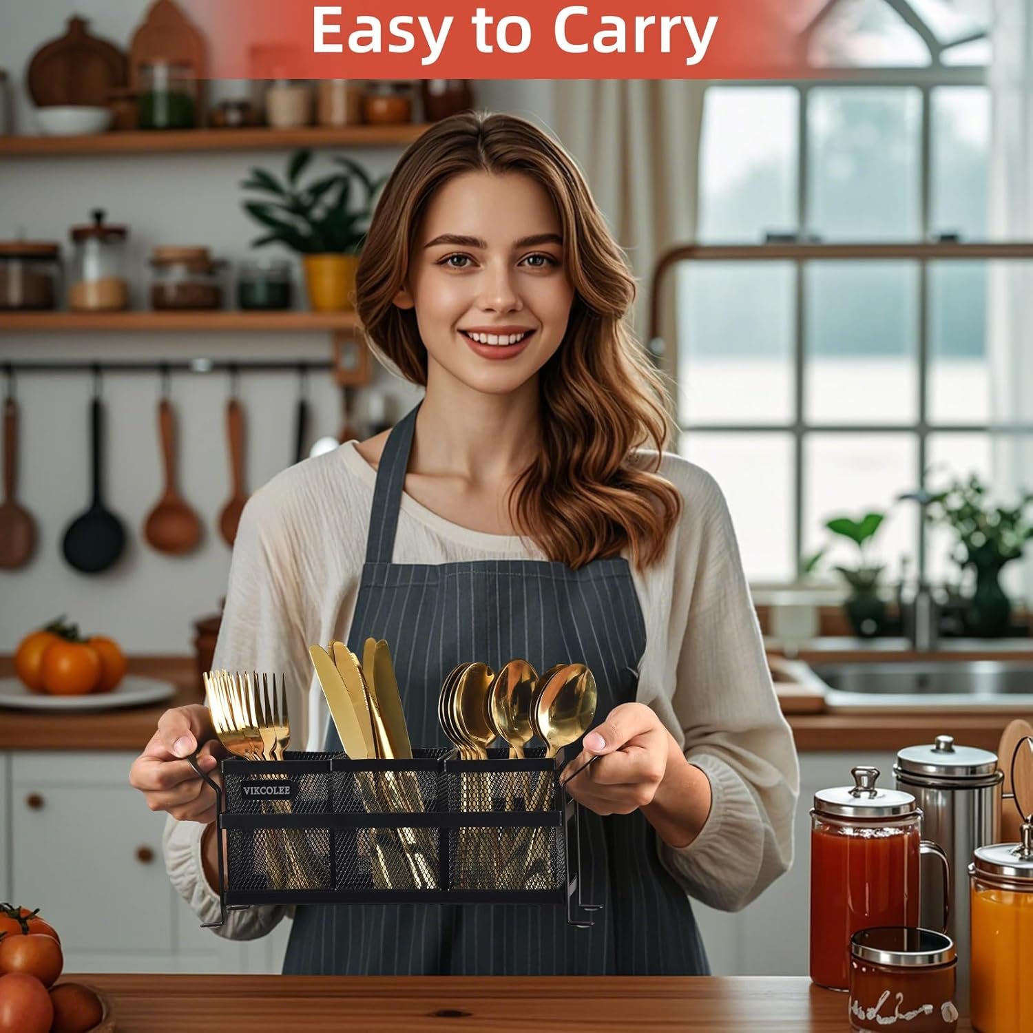 Easy To Transport & Use: Carrying this metal cutlery caddy is a breeze, thanks to its black metal handles. Easily load up your kitchen utensil holder with items and take it indoors or out for meals!