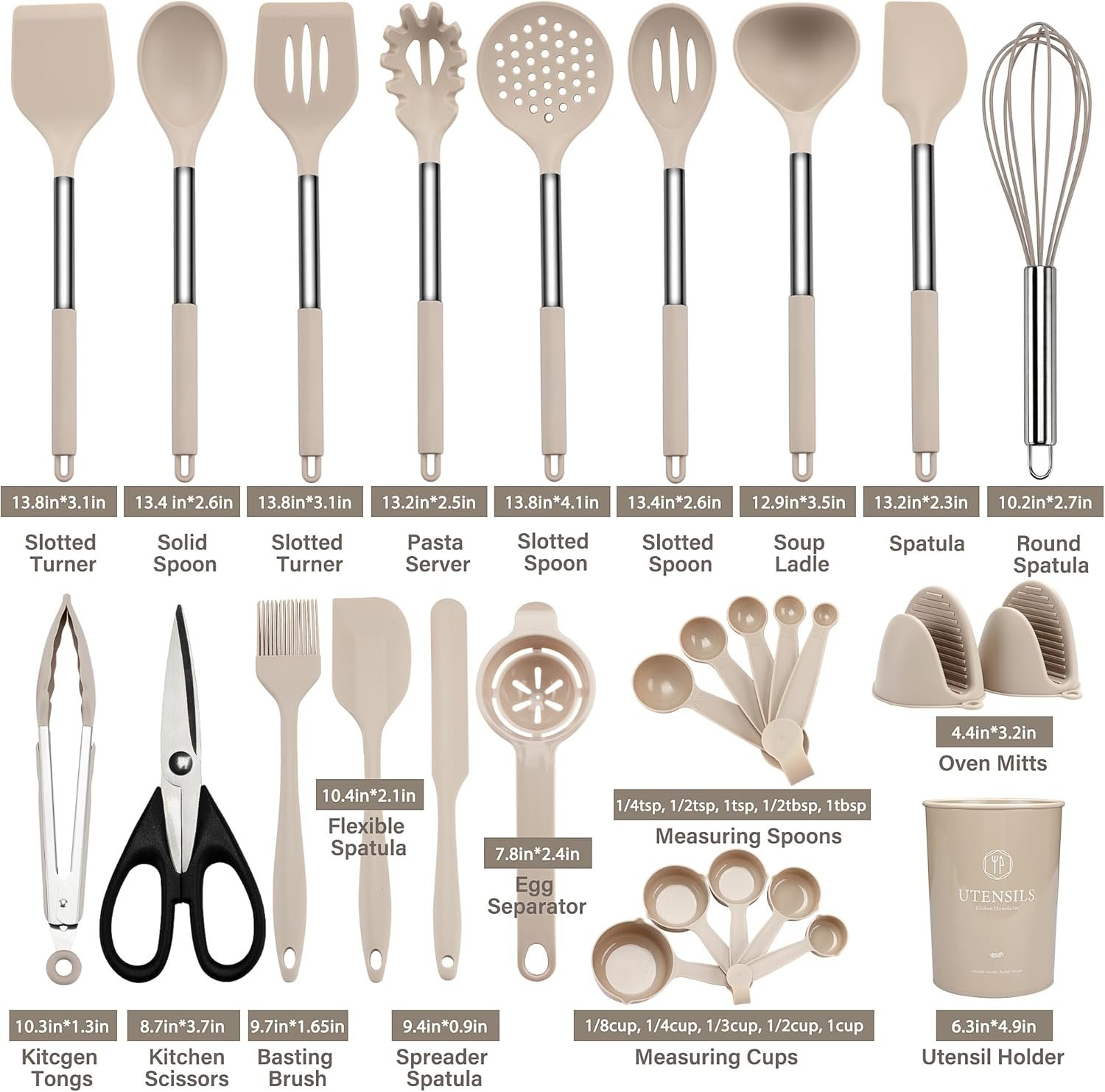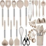 Kitchen Utensils Set, 28 Pcs Silicone Cooking Utensils Set with Holder, Spatula Set, Silicone Whisk, Scissors, Measuring Cups and Spoons Set with Stainless Steel Handle Kitchen Gadgets (Khaki)