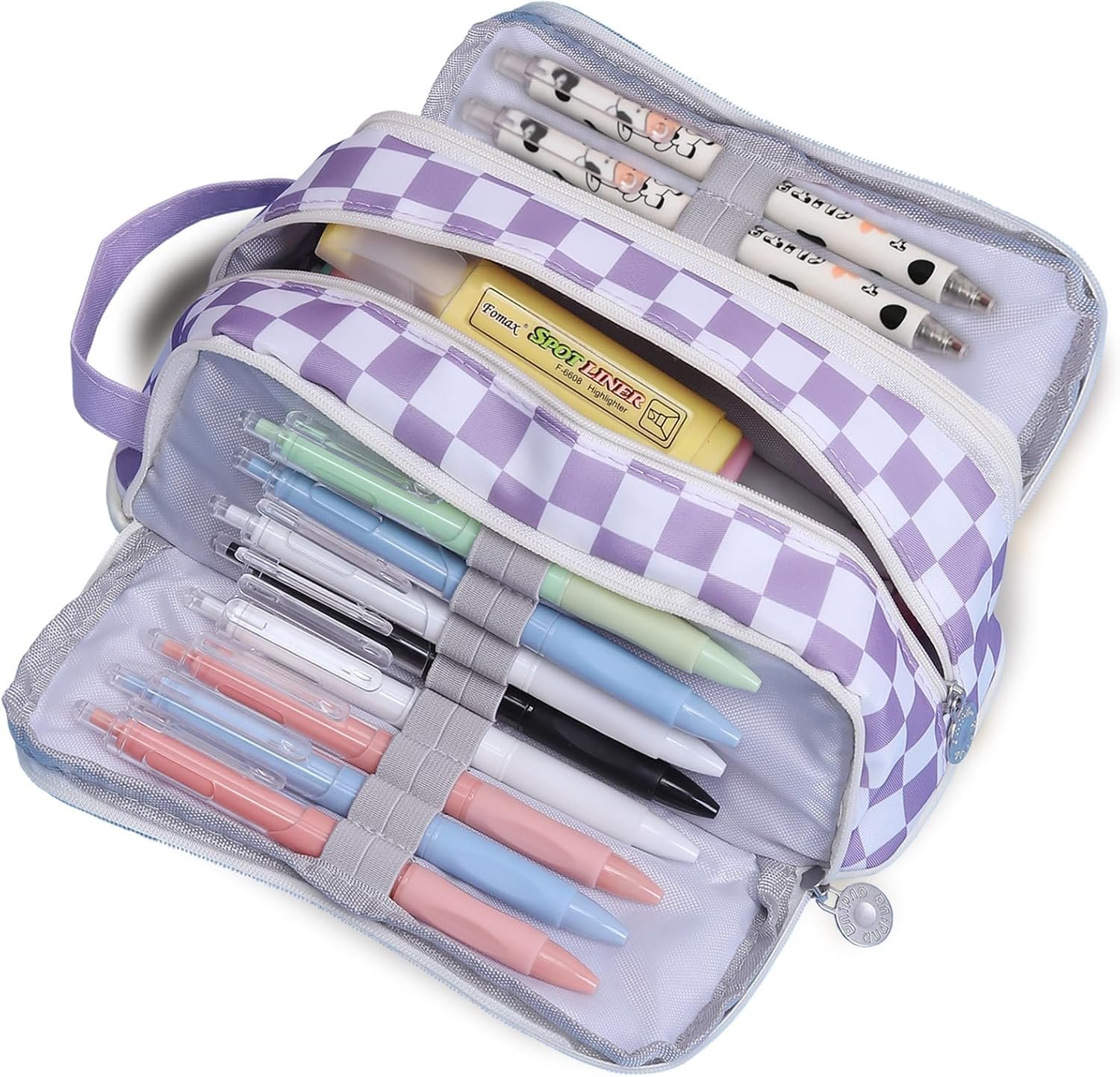 KITENROM Large Pencil Pouch Pen Case Pencils Holder Bag for Office Writing Stationery Supplies Bags Big Capacity Pens Organizer Travel Cosmetics Storage Purple Checked Plaid Accessories Not Included