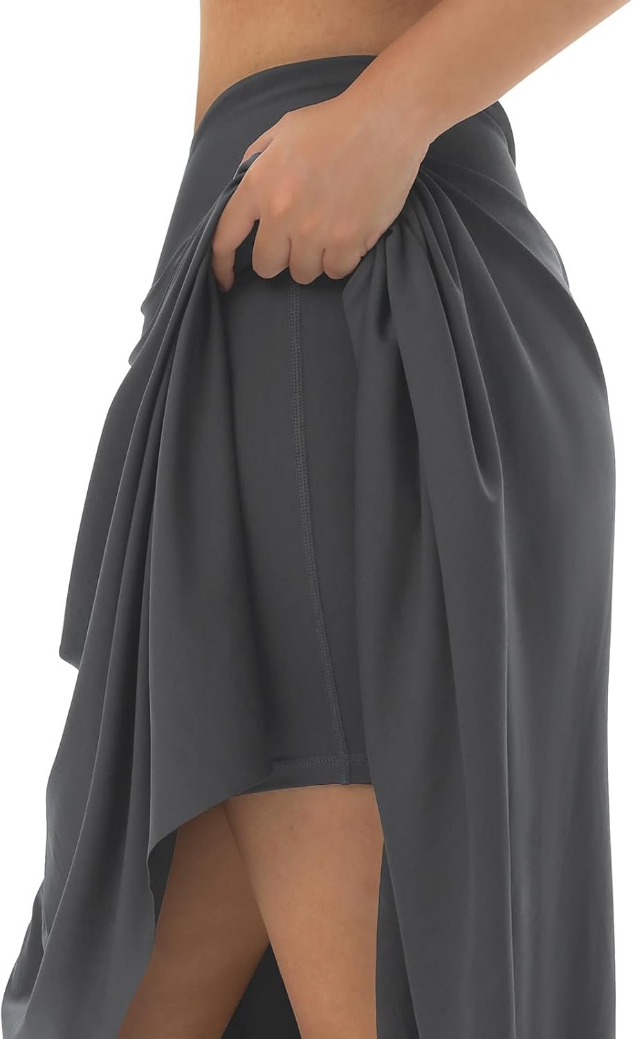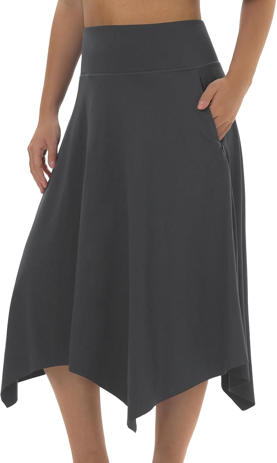 Customers find the skort flattering, with one noting its attractive asymmetric hemline, and appreciate its comfortable fit, substantial material, and great zipper pockets. The fabric is stretchy and wrinkle-free, though opinions about its thickness are mixed, with some saying it’s not too thick while others find it too light. The sizing runs small, particularly for plus sizes.