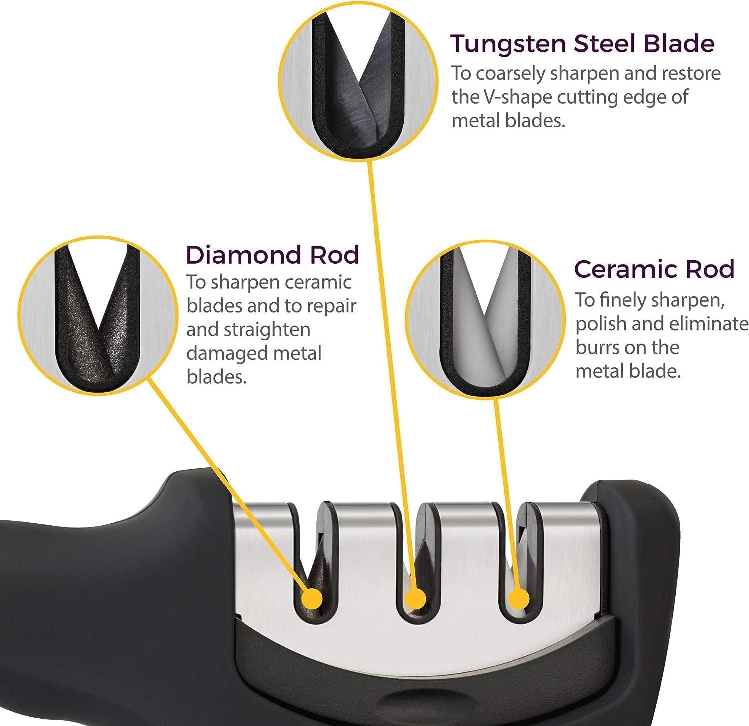 3-stage knife sharpener keeps your entire steel or ceramic knives razor sharp for daily use. Ergonomic design and non-slip base make it comfortable and safe to use. Works efficiently with ideal rod angles.