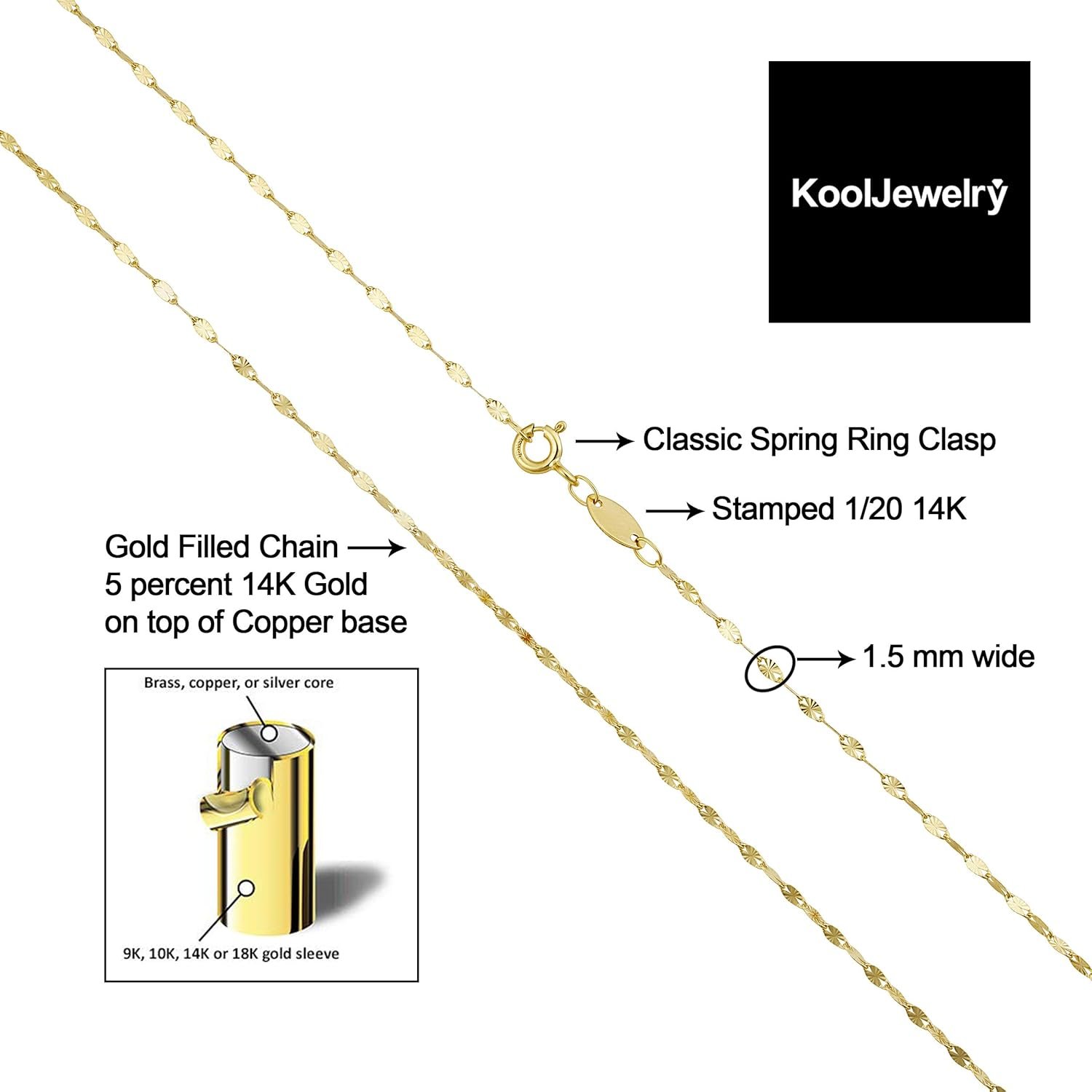 Gold filled jewelry comprises of a layer of solid gold, mechanically bonded to a base metal. Unlike any other electroplated metals, gold filled jewelry constitutes five percent gold metal content and the karat of the gold alloy should be indicated on its finished products. Specifically, our gold filled chain necklaces are 14k gold filled with copper as its based metal and a stamp of “1/20 14K” can be found in our gold filled products.