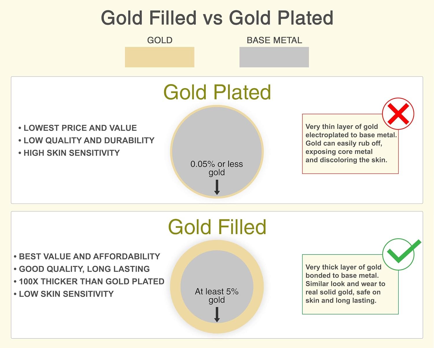 Gold filled is the absolute perfect alternative for genuine gold products as it has the same appearance as karat gold and lasts much longer than any electroplated metals; it can even last a lifetime with proper care.