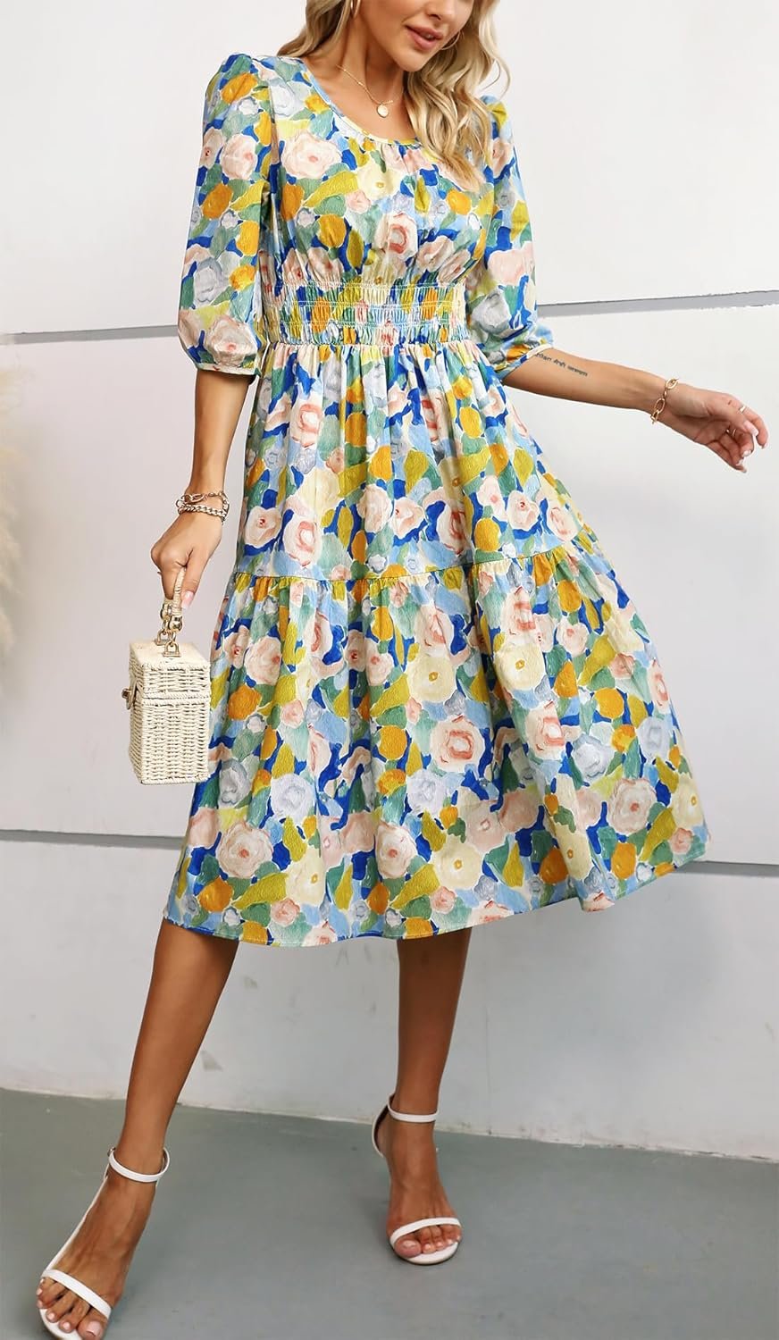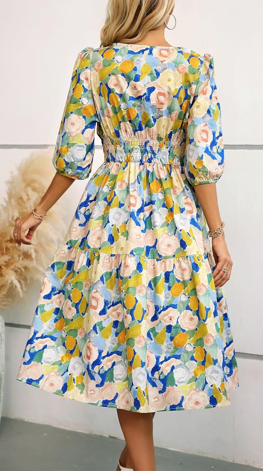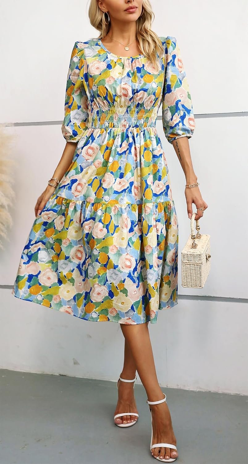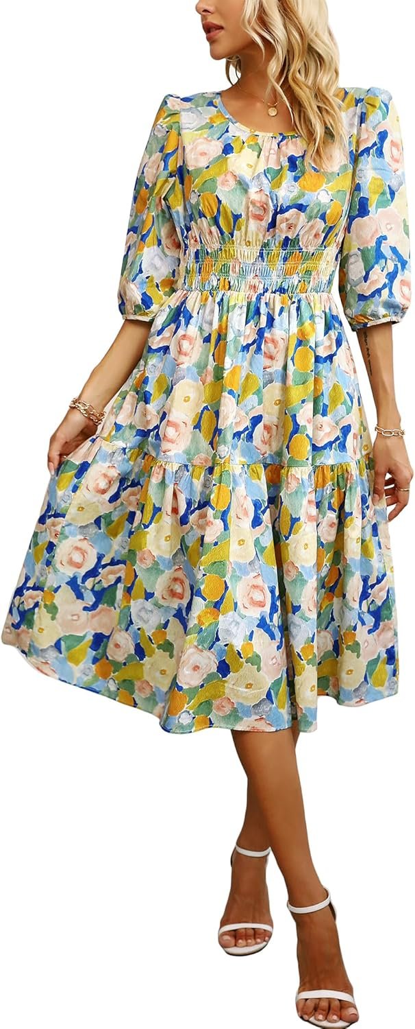 Kormei Women Casual Boho Floral Round Neck 3/4 Sleeve Smocked Waist Tiered A Line Flowy Swing Midi Dress Long Dresses