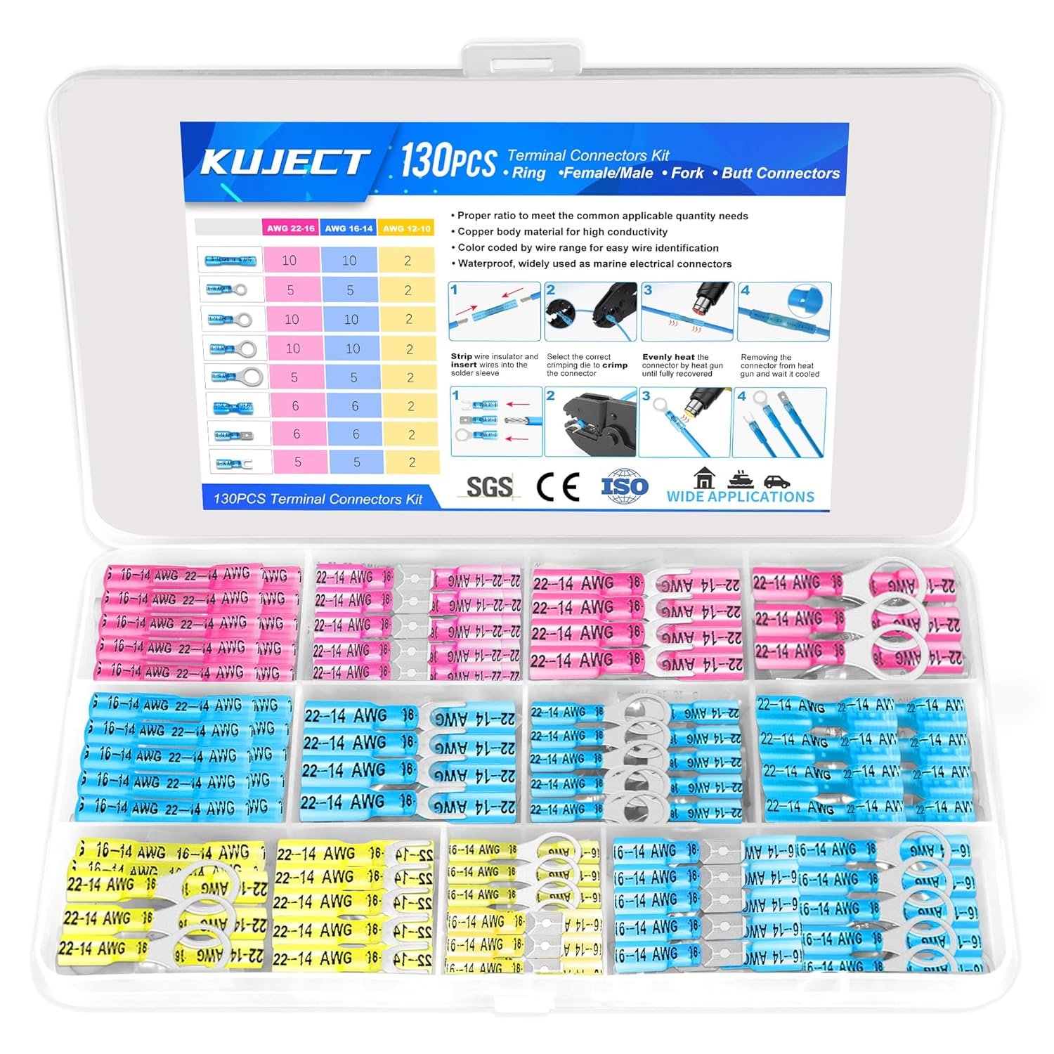 Kuject 130PCS Heat Shrink Wire Connectors Kit, Electrical Waterproof Crimp Butt Terminals, Insulated Spade Connectors for Automotive Marine Boat Truck, Include Rings Forks Spade Butt Splices