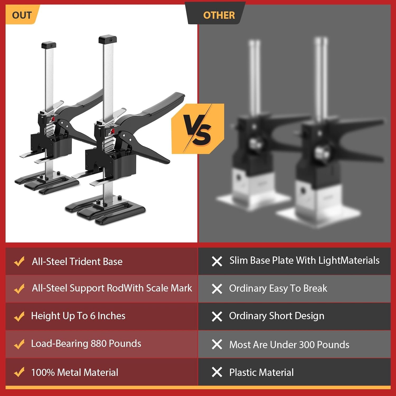 All Steel Solid Base, Load-Bearing And Durable- Innovative lifting tool, thickened double clip solid steel bottom plate, stable center of gravity, lifting capacity of 440 pounds, and 6.7 inches of lifting capacity through handle adjustment spring. Selected high strength spring, longer service life