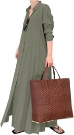 Ladyful Women’s Button Down Cotton Linen Shirt Dress Long Sleeve Maxi Shirtdress Beach Summer Dress Pockets