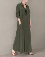 Womens cotton linen shirt dress with long sleeve, button down, two pockets on the side, lightweight and soft, can be wore on beach, work, party, special occasion.