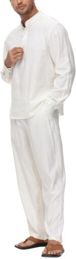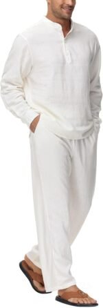 Lamgool Men’s Linen Set 2 Pieces Long Sleeve Button Henley Shirts Casual Drawstring Pants Summer Beach Yoga Outfits