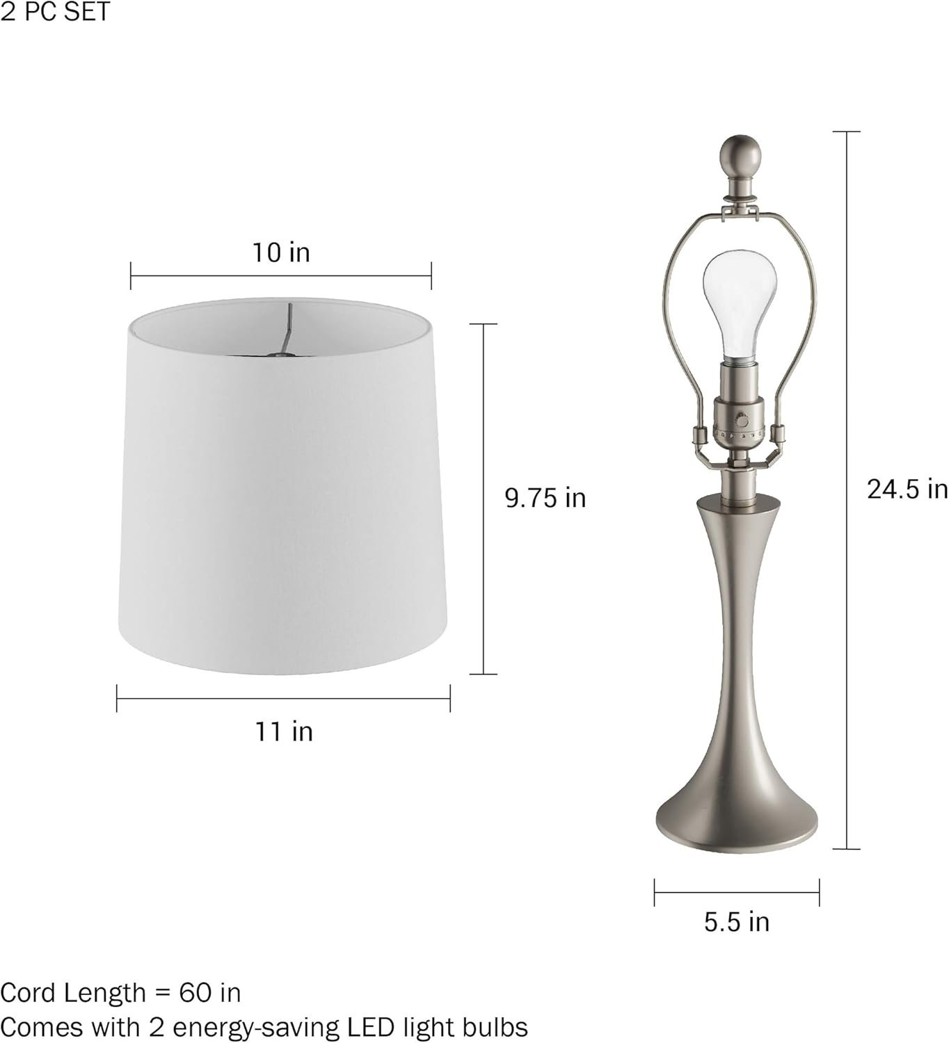 PRODUCT DETAILS – Materials: Steel and a Polyester-Cotton Blend. Dimensions: (L) 11″ x (W) 11″ x (H) 24.5″; Shade Dimensions: (W) 11″ x (H) 9.75″; Cord: (L) 60″. Set of 2. Includes Two 9W LED Bulbs. Color: Brushed Silver and Ivory.