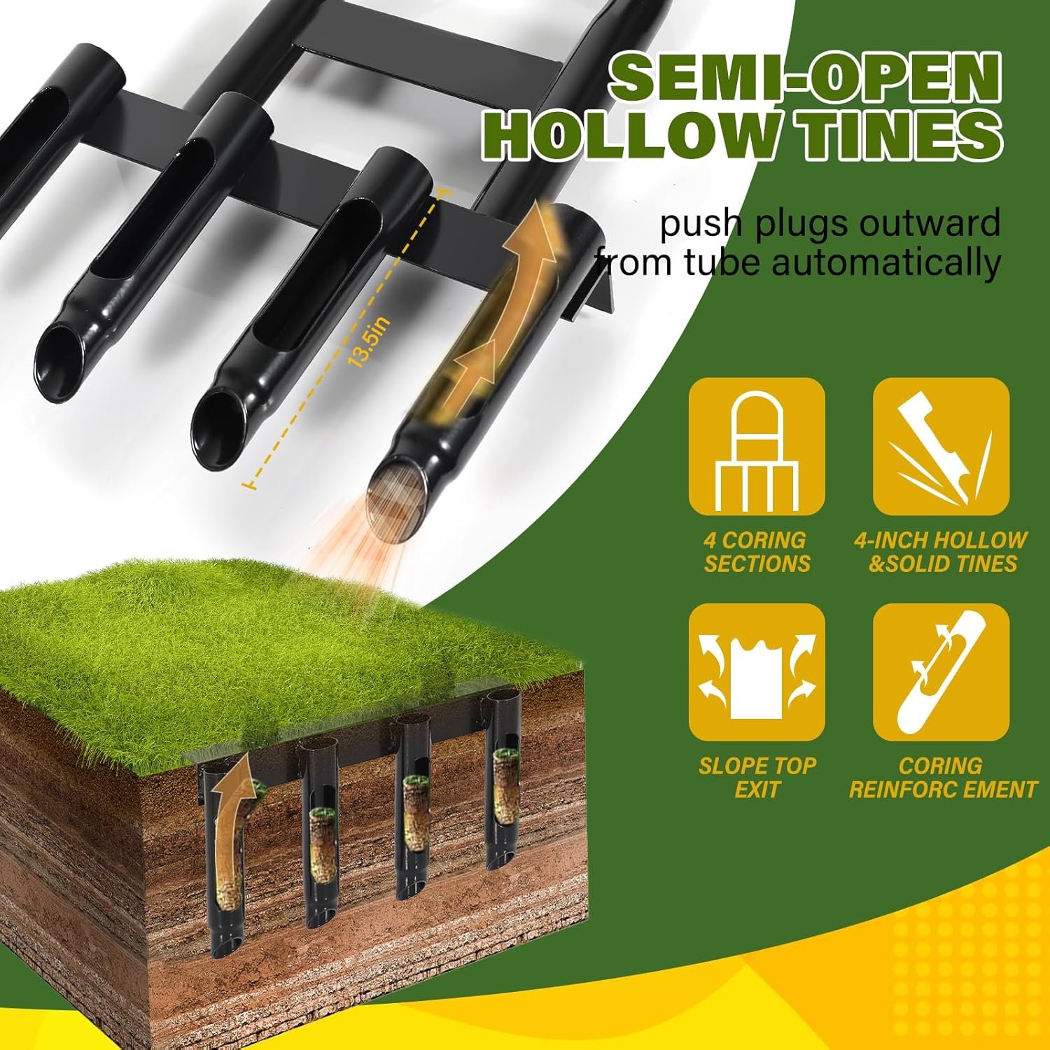 Say Goodbye to Clogged Aerators! Our semi-open hollow tines let soil plugs discharge automatically, preventing clogs and eliminating the need for constant cleaning. Spend less time maintaining your tools and more time enjoying your lawn. Effortless aeration, zero hassle—get the job done right!