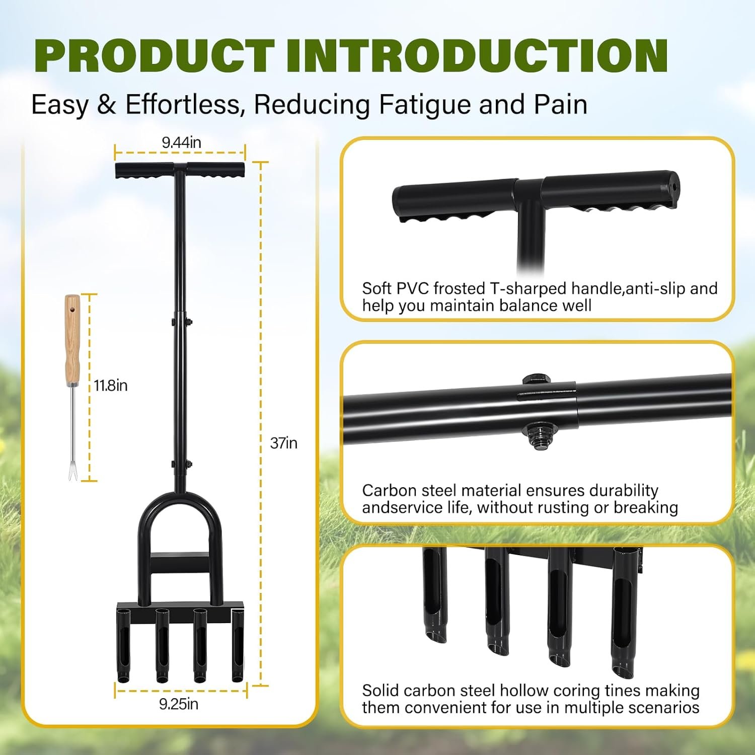 Maximum Efficiency, Minimum Fatigue! Equipped with four sharp tines and a 3.5-inch tine depth, our core aerator lawn tool delivers deep soil penetration for healthier roots. Standing at 37.4 inches with a sturdy foot plate, it reduces bending and strain. The 9.5-inch rubber handle ensures a secure, comfortable grip. Work smarter, not harder—achieve a lush, vibrant lawn in less time!