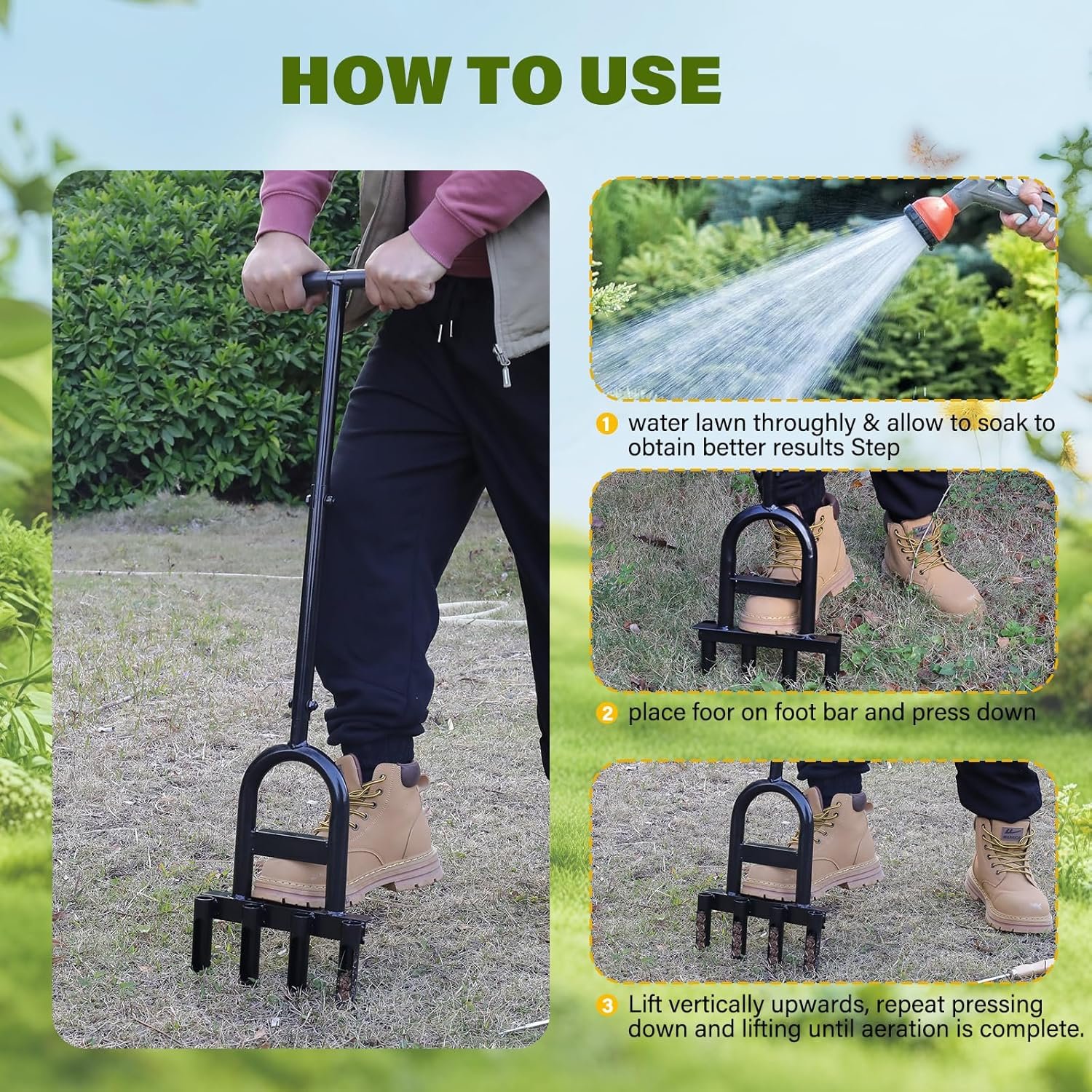 Transform Your Lawn – No Sweat, Just Step! Tired of back-breaking yard work? Get started right away! Easy Setup in Minutes. Our manual core aerator features an integrated footstep design—just step down, and let the sharp tines do the heavy lifting. Quick, efficient lawn care.Pro tip: Ensure your lawn is moist and the soil is soft for optimal results.