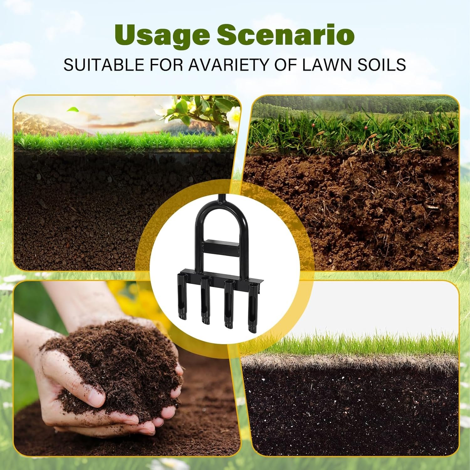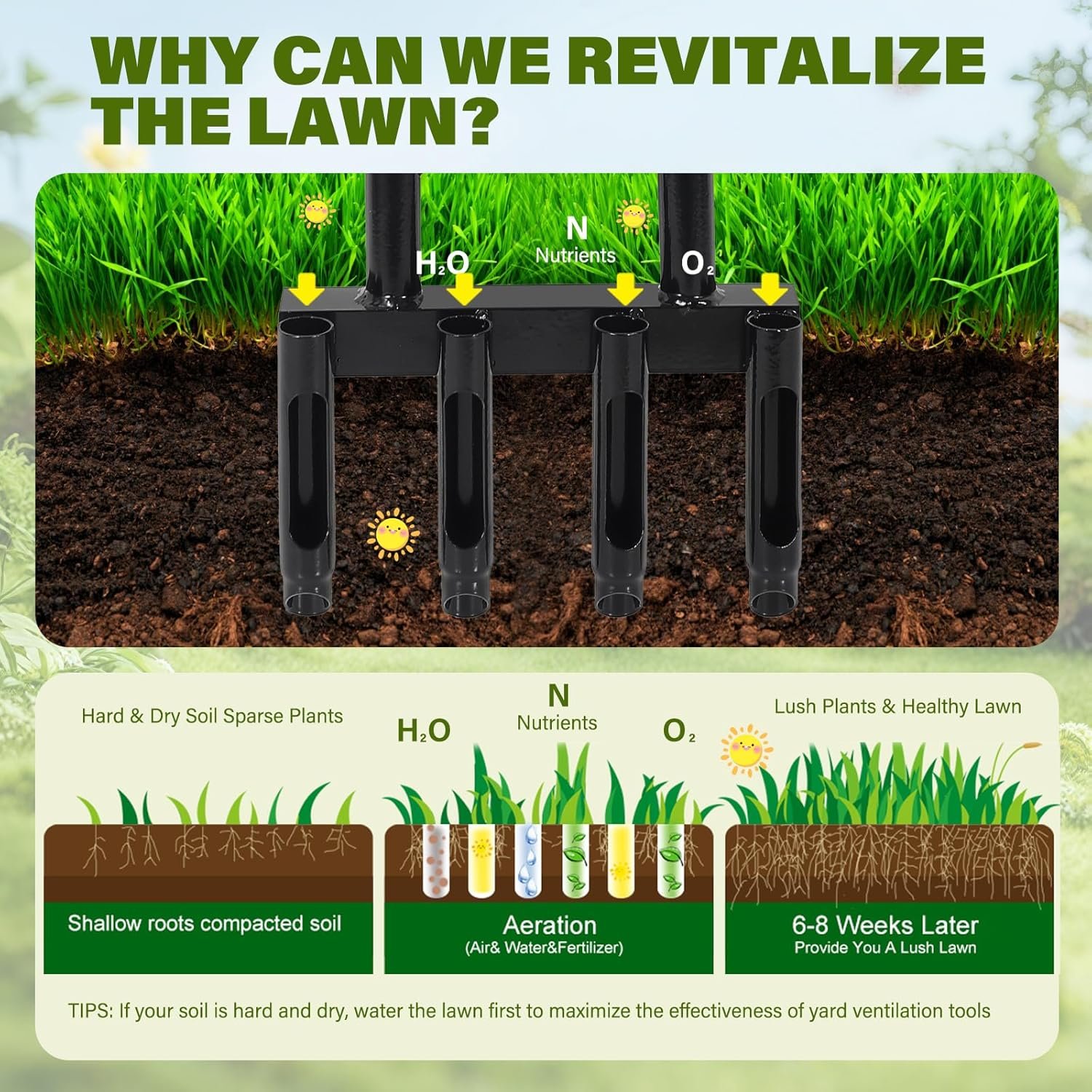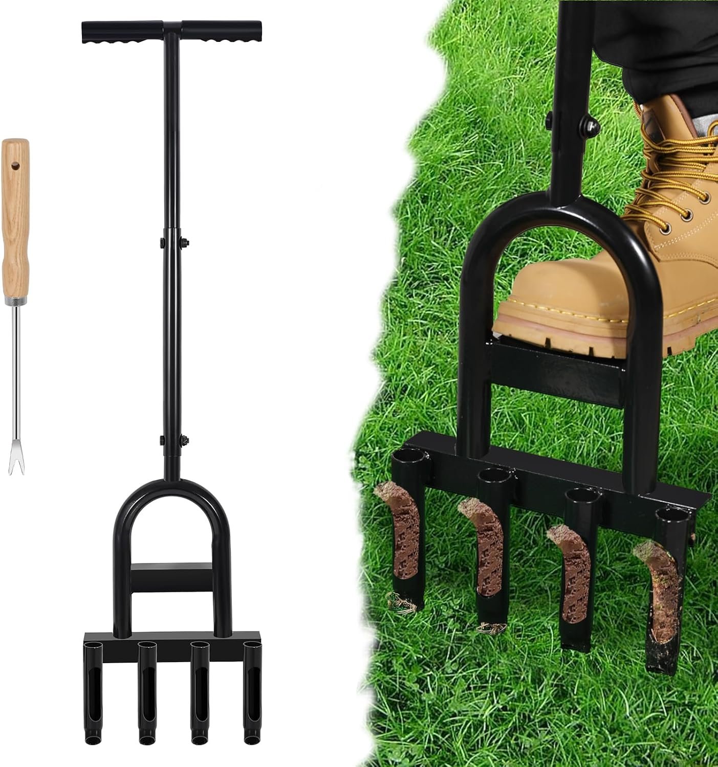 Bonus 2-in-1 Tool, Get more value! Our lawn aerator tool comes with an additional fork-head tool that serves two key functions: cleaning soil plugs from the aerator and removing small weeds. you can aerate your lawn to promote healthy root growth and tackle weeds at the same time, It’s the ultimate all-in-one solution for lawn maintenance!