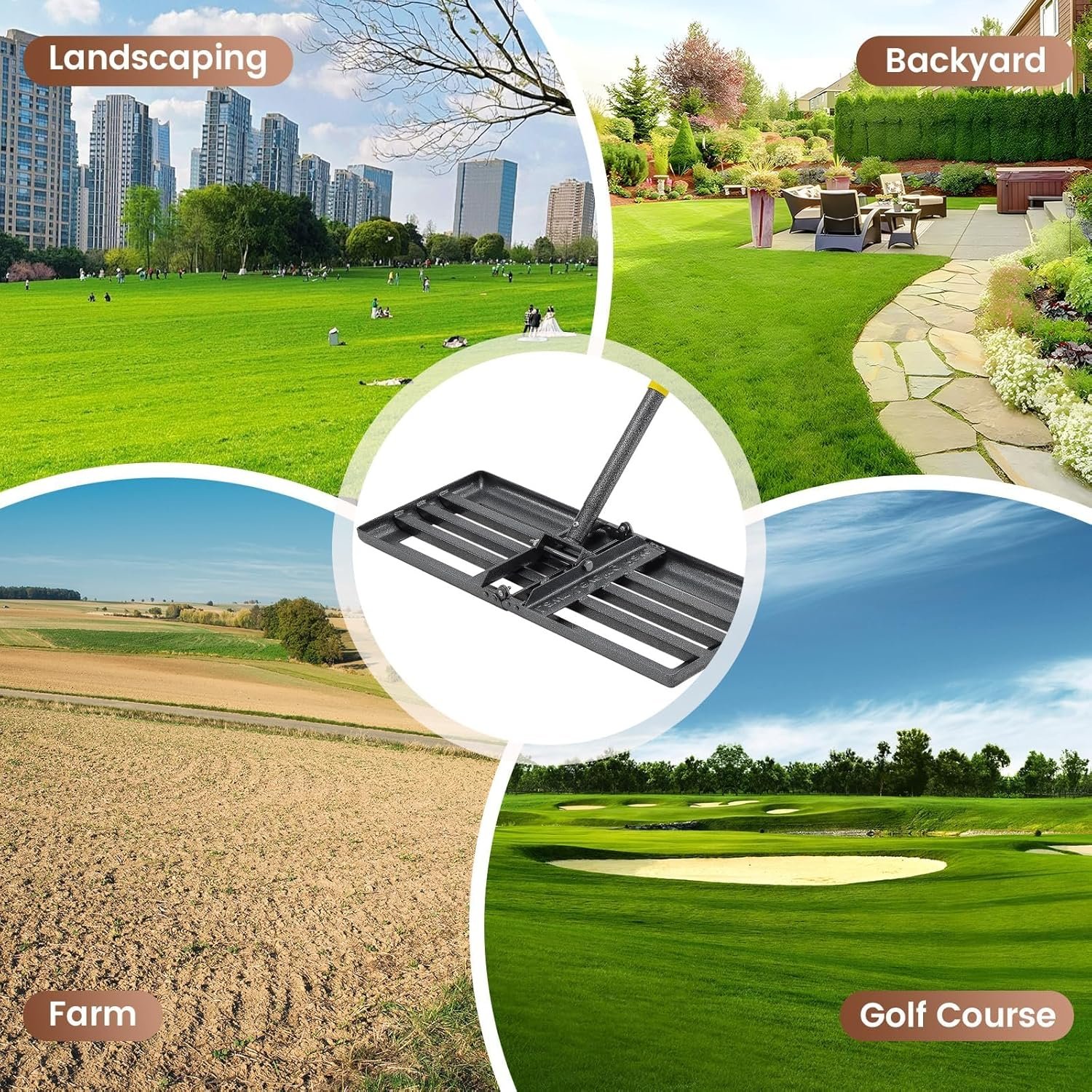 Wide Application: Our ground leveler for yard is suitable for any type of grass, including Kentucky bluegrass, bermuda, ryegrass in gardens, farms, lawns, yards, soccer fields, golf courses and pastures, leveling and composting soil, topsoil, dirt, sand.