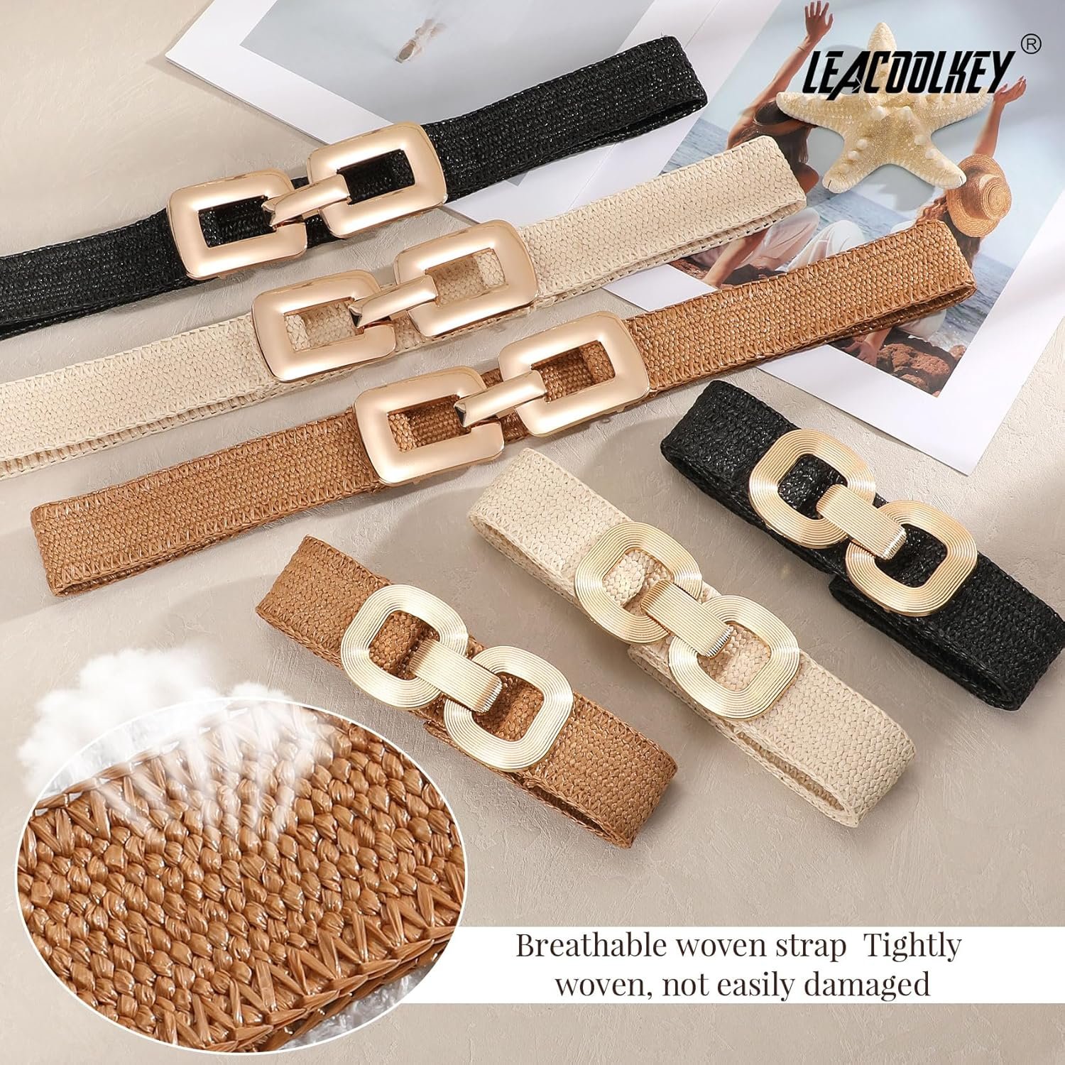 LEACOOLKEY Woven Straw Waist Belt for Women Boho Belt for Dress Braided Wide Stretch Belt