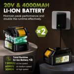 【2*4.0AH & 20V Lithium Batteries】Our cordless leaf blower is equipped with Dual 4.0AH lithium batteries, providing up to 120 minutes of runtime in low-speed mode and 30 minutes in high-speed mode. A convenient battery indicator (25%-50%-75%-100%) lets you monitor remaining power and charging progress with ease. Plus, the built-in protection system automatically shuts off the motor and battery, extending their lifespan and ensuring safe, continuous performance for all your outdoor cleaning needs