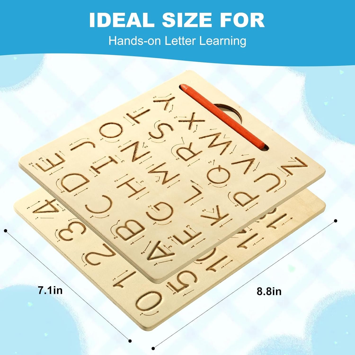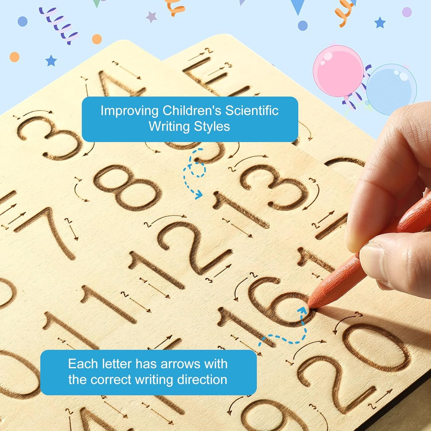 【Double-Side Learning Board】— Wooden board on one side has numbers from 1 to 20, and the other side has a geometry pattern. Handy groove to hold a wooden stylus. Convenient carry sized for in the car and on the go.