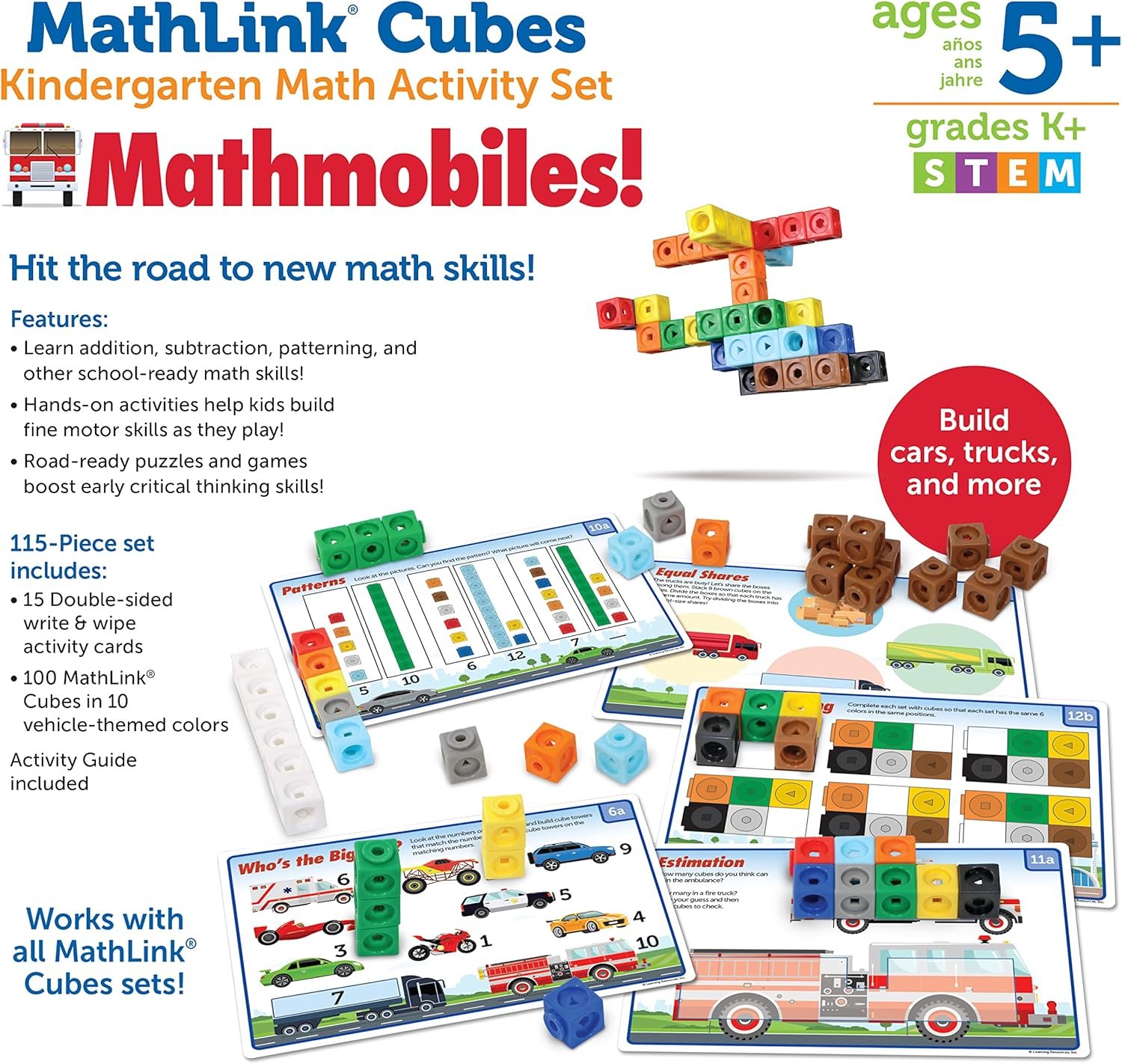 Hit the road to new math skills! Kids learn addition, subtraction, patterning, and other school-ready math skills with the hands-on puzzles, games, and math manipulative challenges found within MathLink Cubes Kindergarten Math Activity Set: Mathmobiles! from Learning Resources. Designed especially for kindergarteners, this educational toy pairs the popular hands-on math manipulatives with a fun set of vehicle-themed challenges that grow with students’ skills. As they explore the 15 double-sided write-and-wipe cards, kids use their connecting cubes to learn kindergarten math fundamentals including sequencing, addition and subtraction, and more! In addition to the cards, the MathLink Cubes Kindergarten Math Activity Set also includes a guide with even more learning ideas and homeschooling activities! Plus, each math challenge turns into hands-on play with the help of 100 included MathLink Cubes in 10 vehicle-theme colors—use the linking cubes to build a car, truck, train, and more! This MathLink Cubes Kindergarten Math Activity Set works with all MathLink Cubes sets—build even more skills!