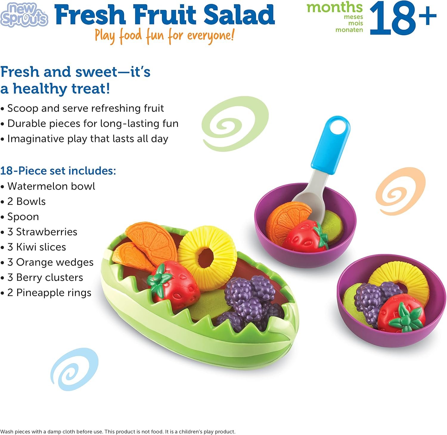 There’s nothing more refreshing than a fresh fruit salad! With a colorful variety of fruits, this special salad will brighten up any occasion. Serve pineapple rings, berry clusters, kiwi slices, strawberries, and orange slices from your very own watermelon boat. Perfect for little entertainers seeking imaginative fun and encouraging healthy eating habits along the way. Watermelon boat measures 8″L x 3″H. Toddlers+. Ages 18 mos+. Set of 18
