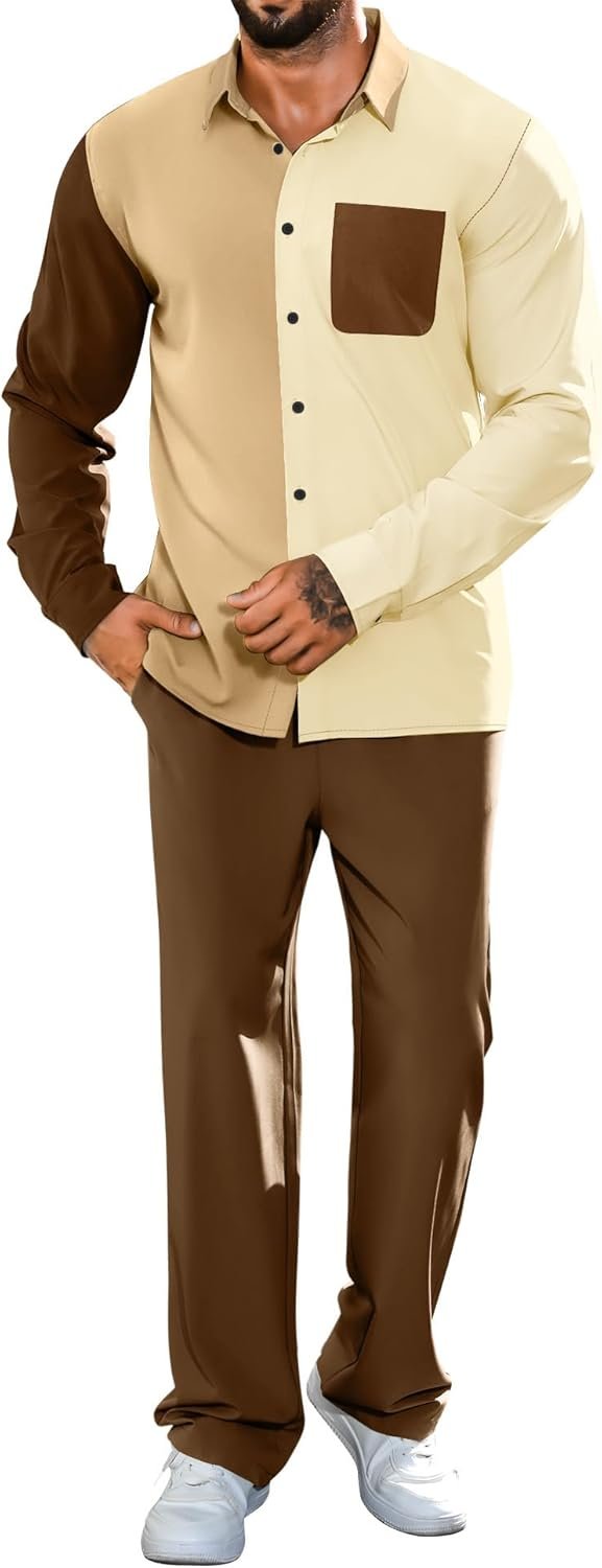 LecGee Mens 2 Piece Color Block Outfits Casual Long Sleeve Button Down Color Block Shirts and Pants Matching Set Sweatsuit