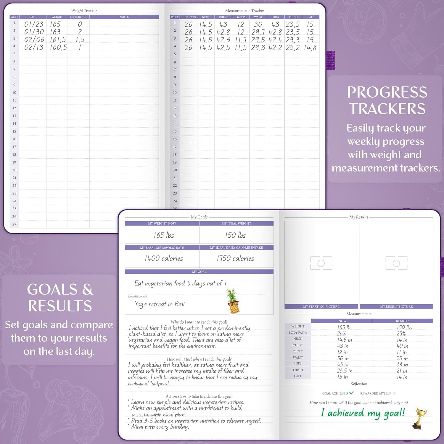 SET GOALS & TRACK YOUR WEEKLY PROGRESS – This food journal for tracking meals and exercise is undated and covers 6 months of daily journaling. Begin your journey by setting your main goal and brainstorming how to achieve it. Use convenient weight and body measurement trackers inside the wellness journal to track your progress every week and visualize how far you’ve come.