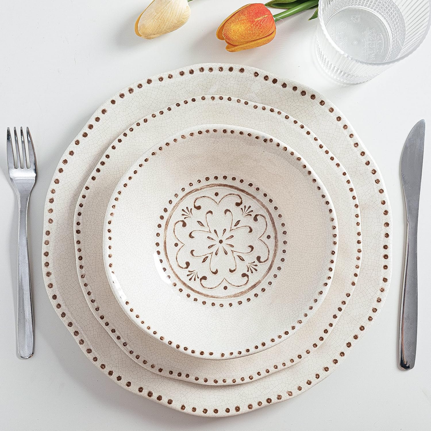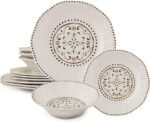 LEHAHA Beaded Crackle 12 Piece Melamine Camping Dinnerware Set, Plates and Bowls Sets, Indoor and Outdoor Use, Break-Resistant Rustic RV Dishes Set, Service for 4(Ivory)…