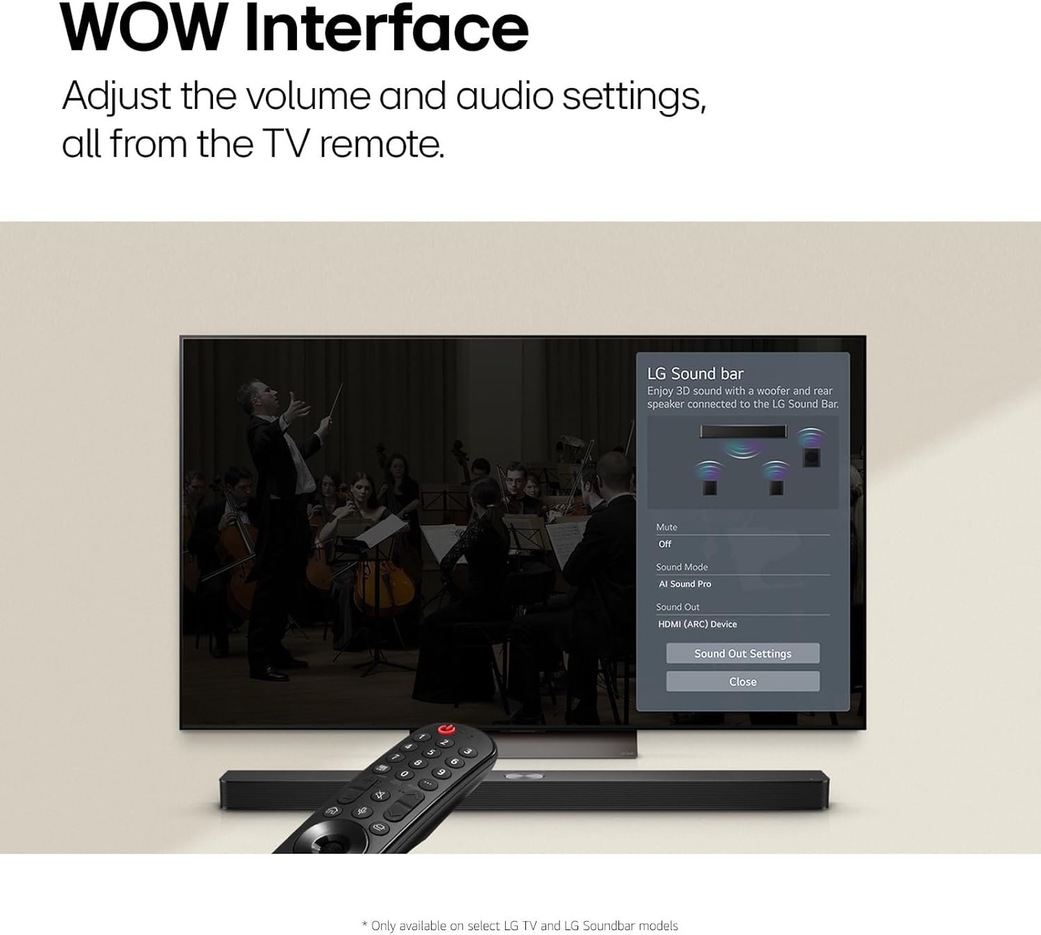 WOW Interface – Now, convenience is in your hand. Control your soundbar and your LG TV with one remote*. Adjust the volume and audio settings, check the connection status and even select a sound mode on the screen, all from the TV remote.