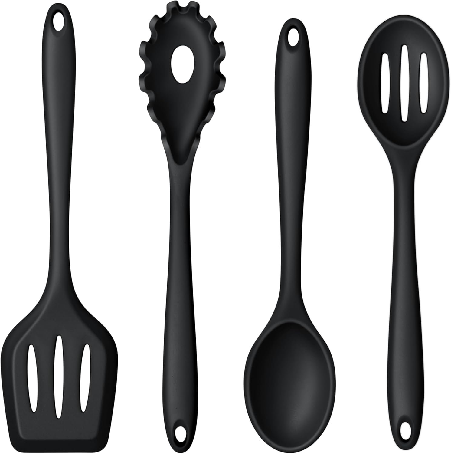 LIANYU Kitchen Utensils Set, 4Pcs Silicone Cooking Utensils, Heat Resistant Kitchen Tools for Stir Frying, Serving, Mixing, Include Turner, Spoon, Pasta Server, Dishwasher Safe, Black