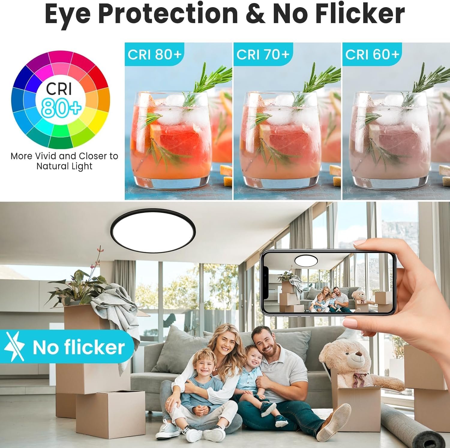 High CRI & Eye-caring Lighting: Our LED ceiling light provides high light transmittance, ensuring even and soft light distribution without glare, protecting your eyes from harsh lighting. With a CRI80+ rating, it brings forth vivid and natural light, accurately representing the true colors of objects. Enjoy eye-friendly lighting that enhances your space