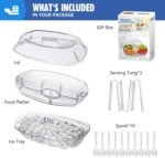 【REMOVABLE 3 LAYER TRAY DESIGN】:Our chilled serving trays for parties have 3 tier tray. The lid for covering food to keep them clean and free from bugs. The food container is divided into 4 separate sections to hold different types of food. The bottom ice tray is used to place ice to keep food cold, and it can be removed at any time to easily replace the melted ice.