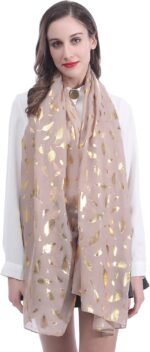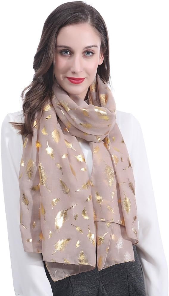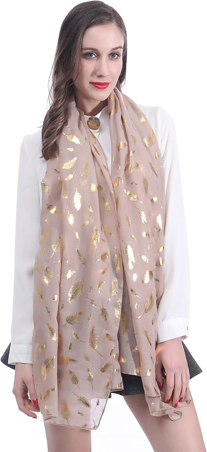 Lina & Lily Metallic Gold Silver Foil Feather Women’s Scarf Shawl Wrap Lightweight