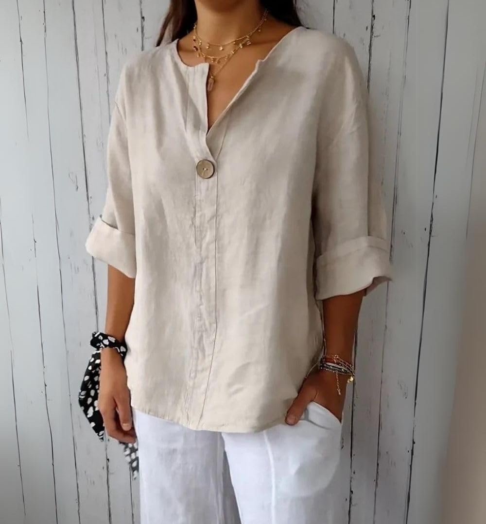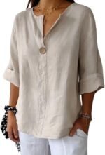 Dressy Causal Linen Tops Long Sleeve/3/4 Sleeve Blouses – with button , v neck,casual cuffed long sleeves, tuckable curved hem, collared v neck, which can be your casual top for hanging around town, or works well for travel because of the versatility to tuck in or wear it open as a spring/summer/fall light layer.