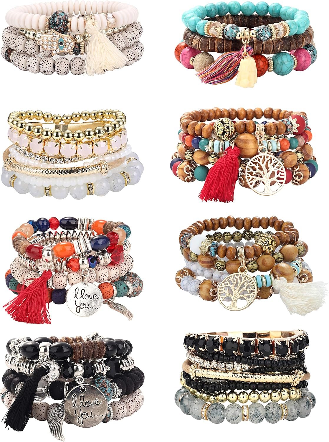 LOYALLOOK 8 Sets Bohemian Stackable Bead Bracelets for Women Stretch Multilayered Boho Stackable Bracelets Stack Beads Multicolor Beaded Strand Bangle Charm Bracelets Boho Tassel Bracelet Set Handmade