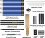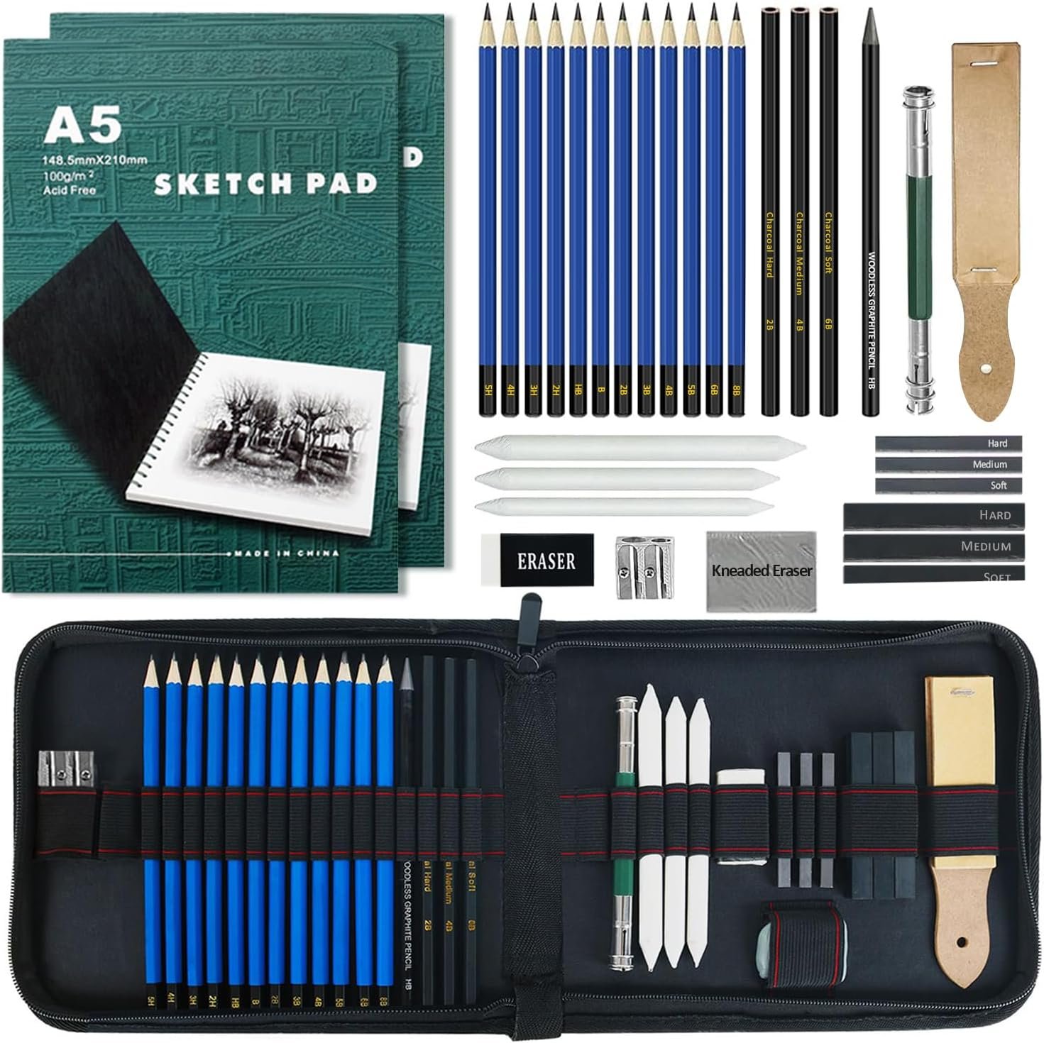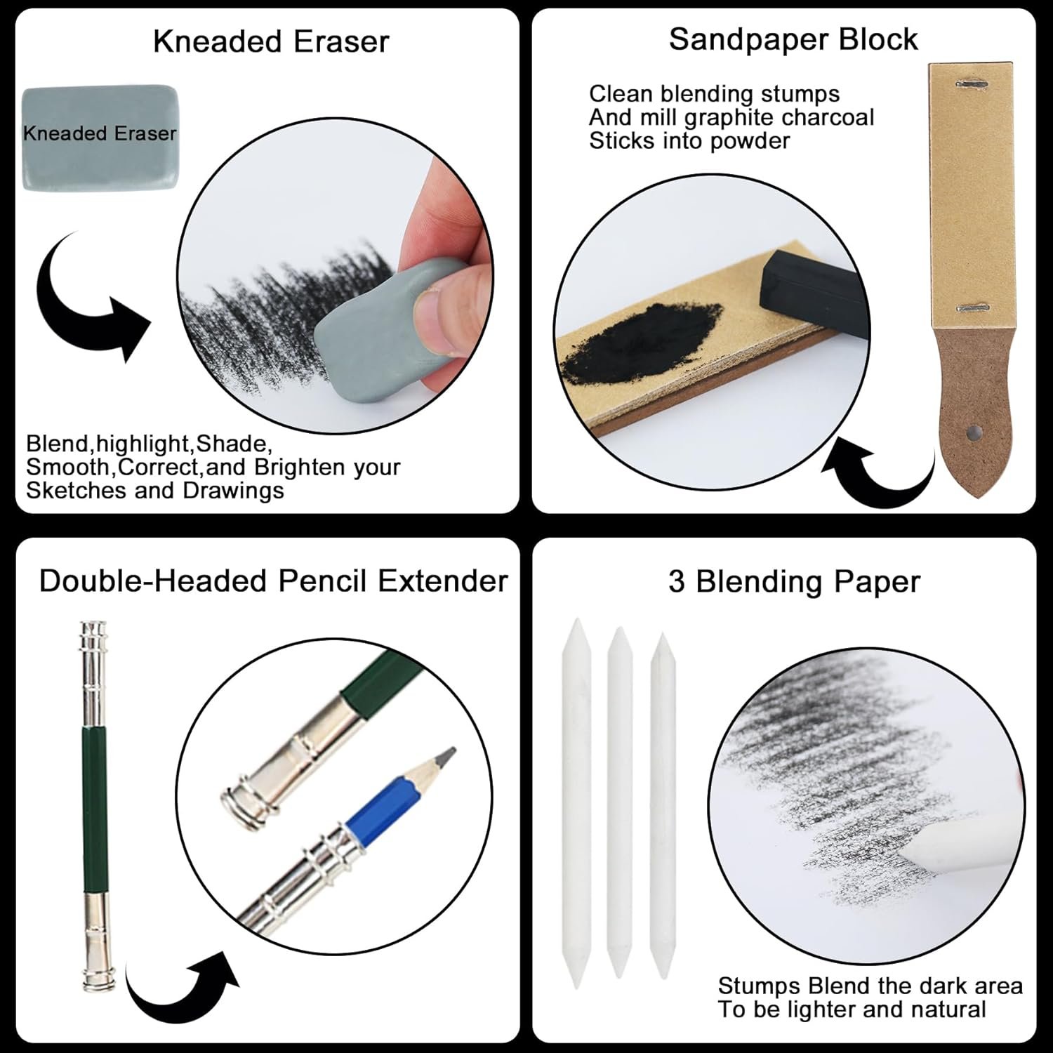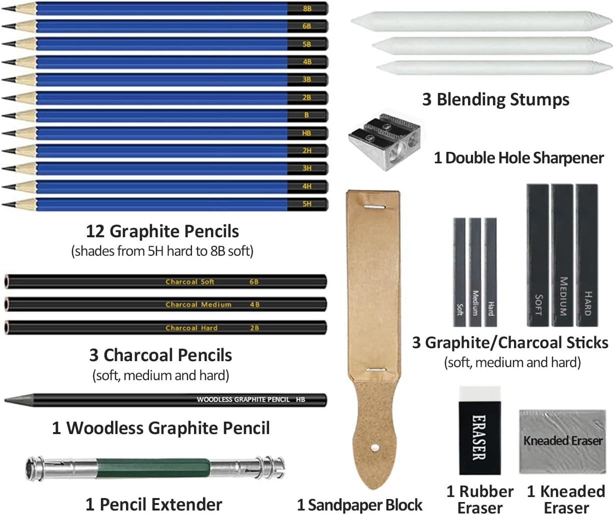 【COMPLETE DRAWING KIT】Our sketching art supplies come with 12 graphite sketching pencils (5H/ 4H/3H/2H/HB/B/2B/3B/4B/5B/6B/8B), 3 charcoal pencils(6B, 4B, 2B), 1 woodless pencil, 3 graphite sticks(soft/medium/hard), 3 charcoal sticks(soft/medium/hard), 3 paper blending stumps, 1 kneaded eraser, 1 rubber eraser, 1 sandpaper strip, 1 pencil extender, 2*12 sketchpad and 1 zippered case