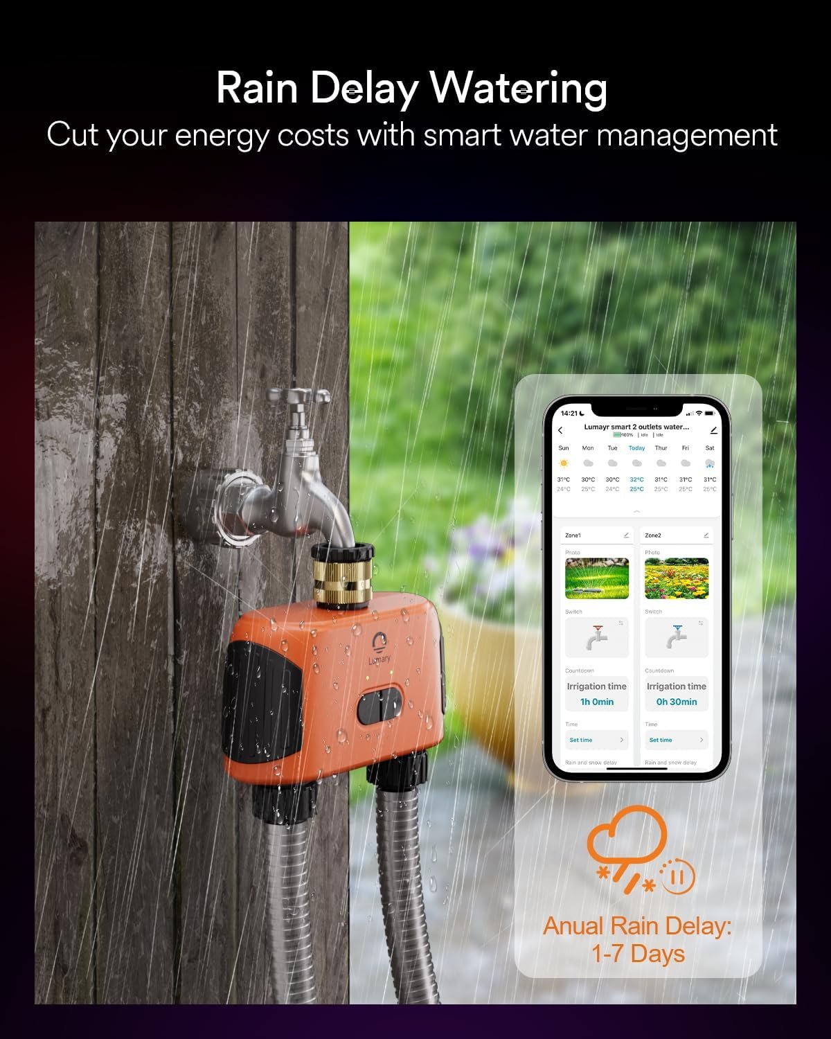 Rain Delay: The Lumary wifi garden hose timer features a Rain Delay function, which you can set to skip watering for 24, 48 or 72 hours to conserve water. You can choose to skip the watering schedule during rainy or snowy days in case to over watering