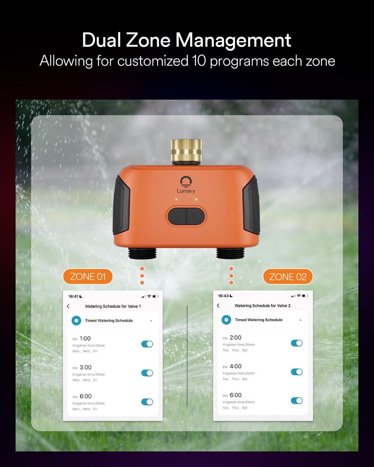 Customizable Zones : Lumary wifi hose timer 2 outlet enables you to personalize the water timers for hoses programmable (watering time, normal schedule, and duration) for each zone, providing you with full customization over the irrigation of every section of your garden and lawn with well-distributed, efficient, and easy lawn watering