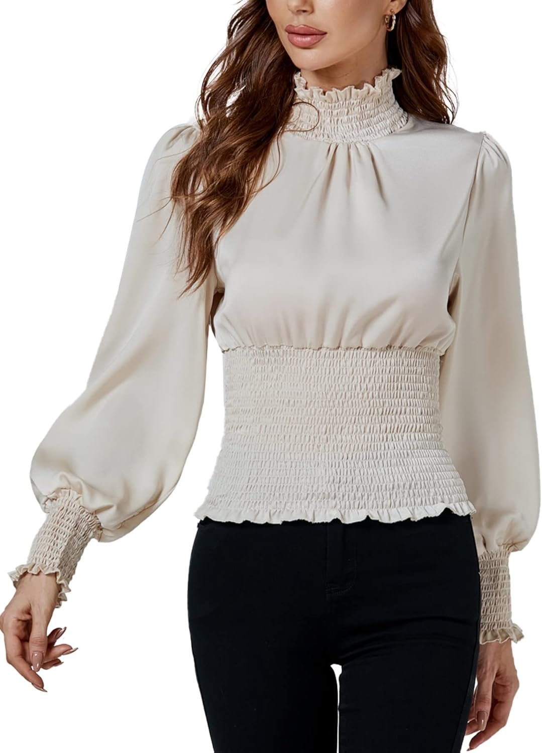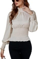 LYANER Women’s Shirred Frill Mock Neck Smocked Puff Long Sleeve Blouse Top