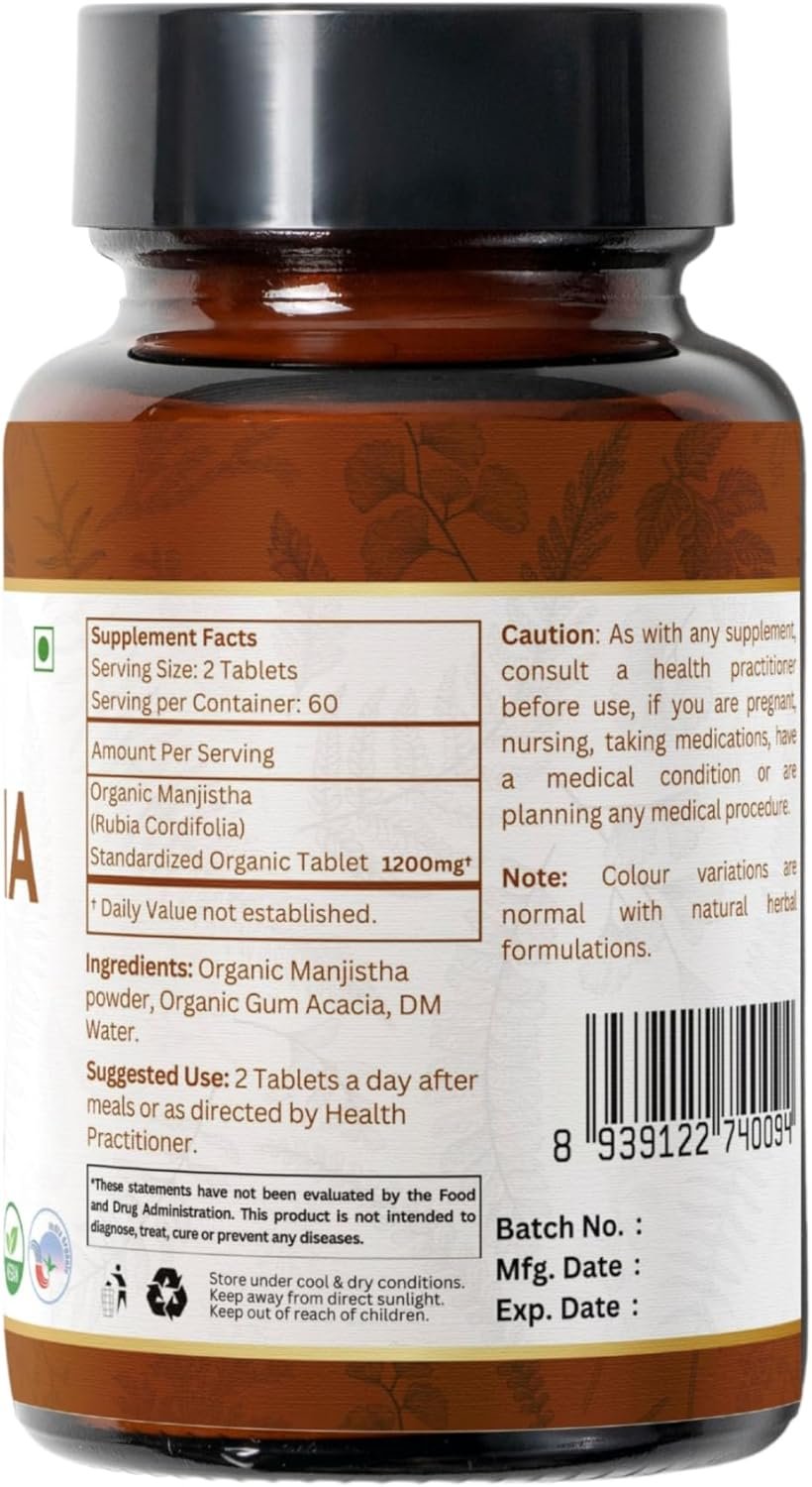 MANJISTHA 120 Tablets | Rubia Cordifolia (Manjistha) |Organic and Natural | Vegan and USDA Certified 120tab