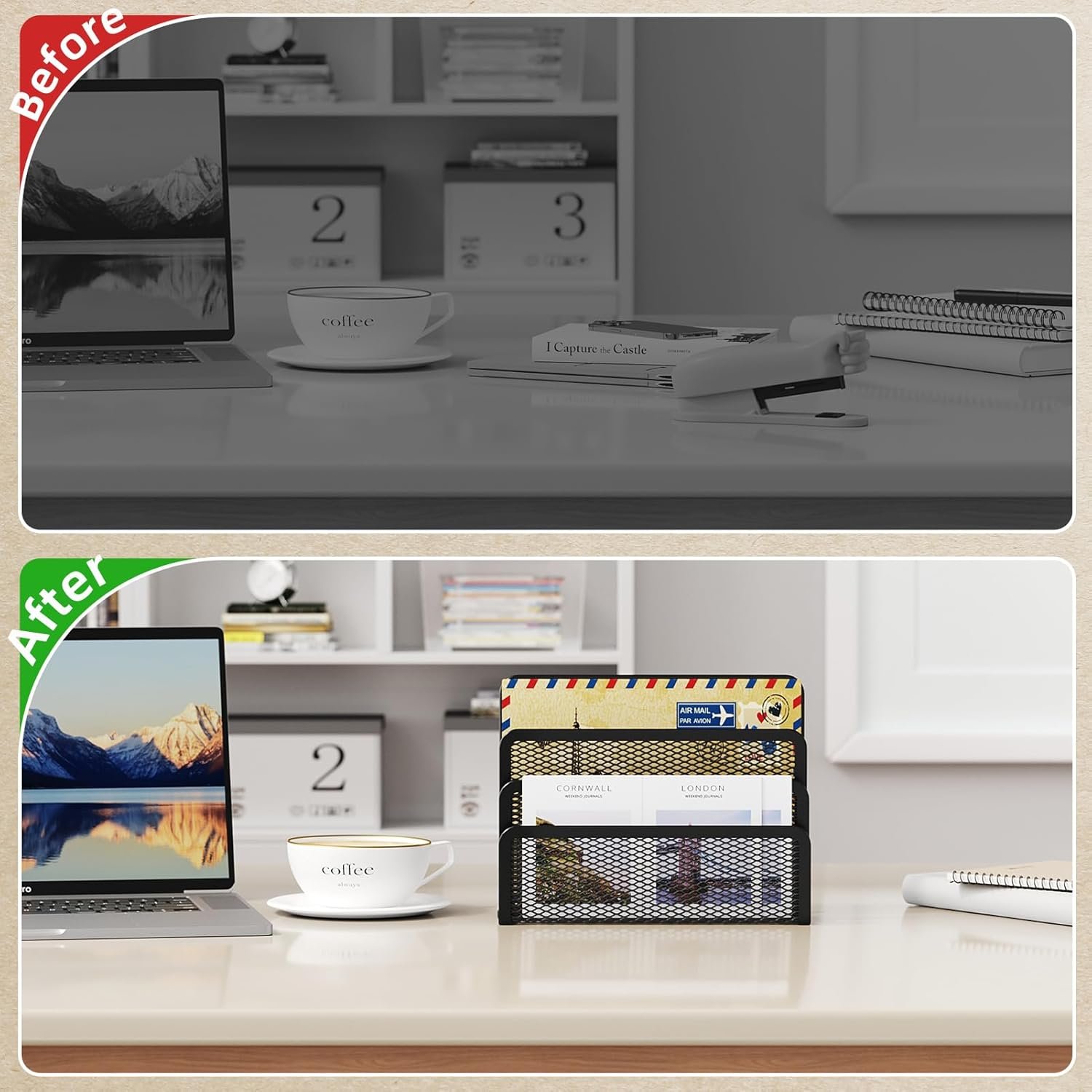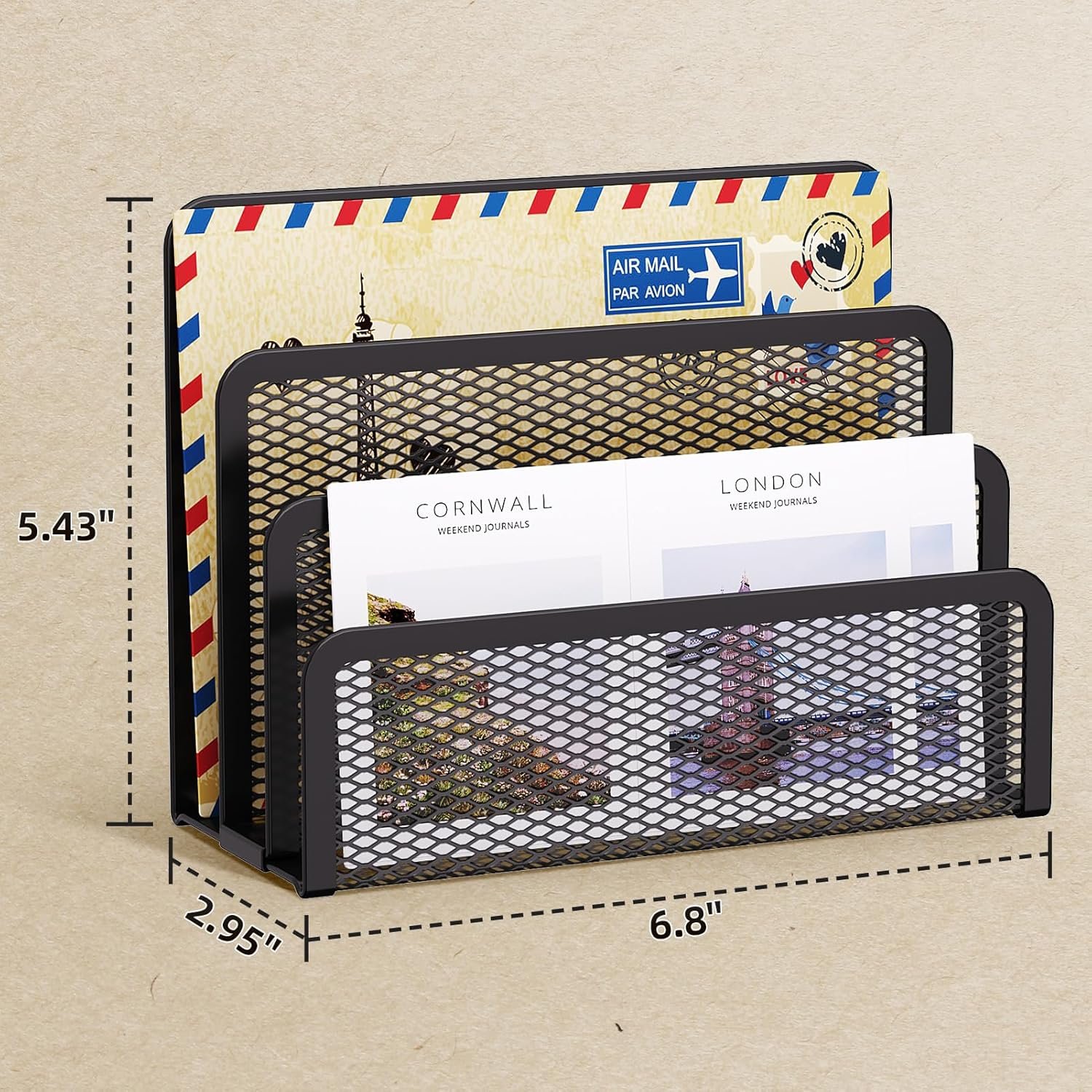 Marbrasse Mail Organizer for Desk, 3-Slot Mesh Metal Mail Holder countertop, Letter Holder, Office Desktop Envelope and Document Storage Rack (Black)