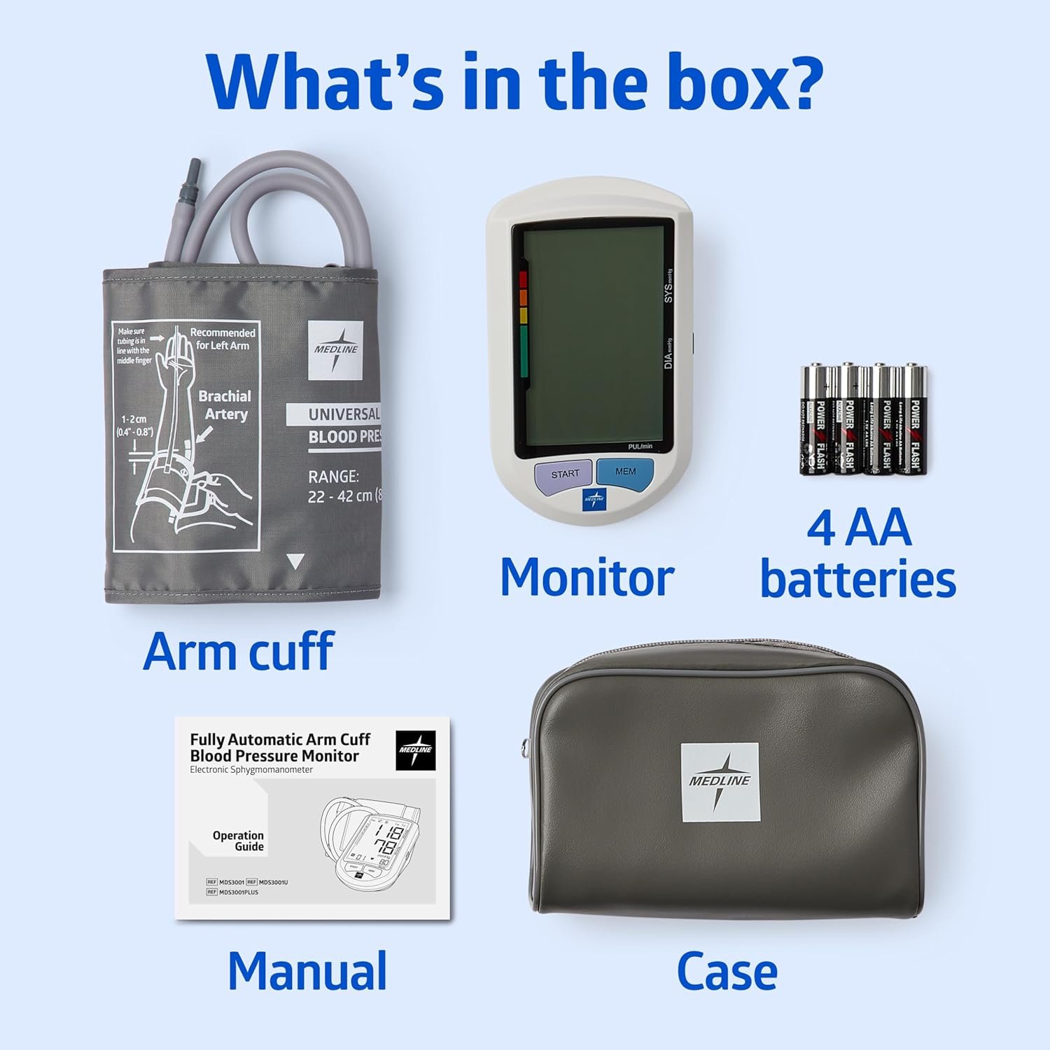 EVERYTHING YOU NEED: Includes carrying case for easy portability, monitor device, universal cuff (22-42 cm, 8.6”-16.5”) and 4 replaceable AA batteries, 2 year warranty