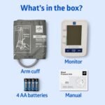 Package includes automatic blood pressure unit, 4 AA batteries, and adult sized upper arm bp cuff