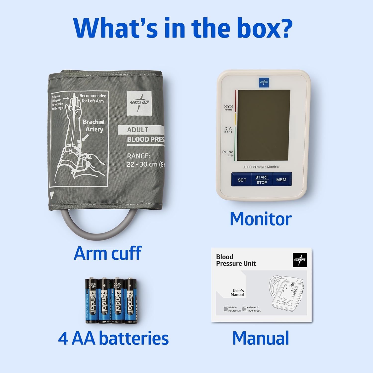 The Medline digital blood pressure monitor with standard adult bop cuff offers customized inflation levels for each individual patient and color gauge for quick detection. The revolutionary design and proprietary programming provide automatic inflation and error detection. Blood pressure unit provides quick digital readings of systolic / diastolic pressure and pulse rate and stores the 90 most recent measurements for 2 users. Easy-to-use one-push button design and large digital readout on the LED display shows date and time. Includes the automatic blood pressure unit, standard adult cuff, quick start guide, instruction manual and four AA batteries.