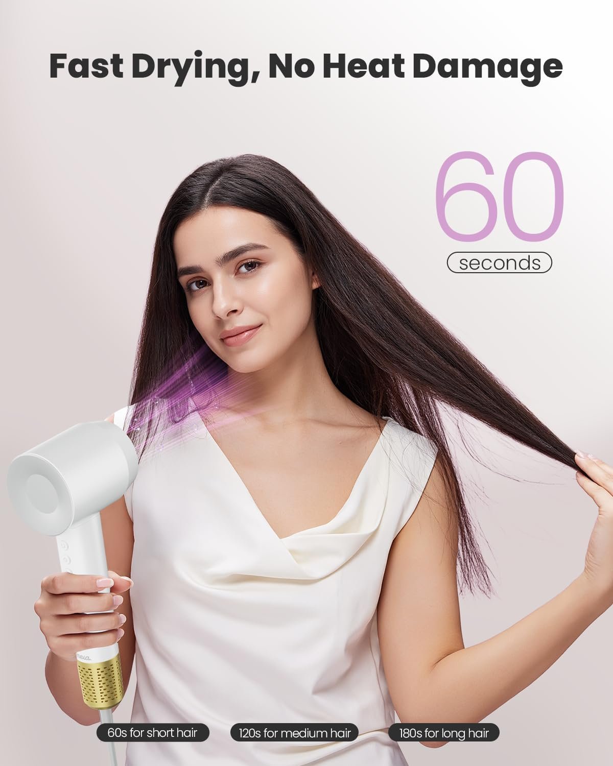 𝑼𝒍𝒕𝒓𝒂-𝑭𝒂𝒔𝒕 𝑫𝒓𝒚𝒊𝒏𝒈 𝒘𝒊𝒕𝒉 𝑨𝒅𝒗𝒂𝒏𝒄𝒆𝒅 𝑴𝒐𝒕𝒐𝒓 ➤ Equipped with a 110,000 RPM brushless motor, our dryer cuts drying time by 80%* while maintaining hair integrity through aerodynamically optimized airflow. (*Compared to conventional 18,000 RPM dryers)