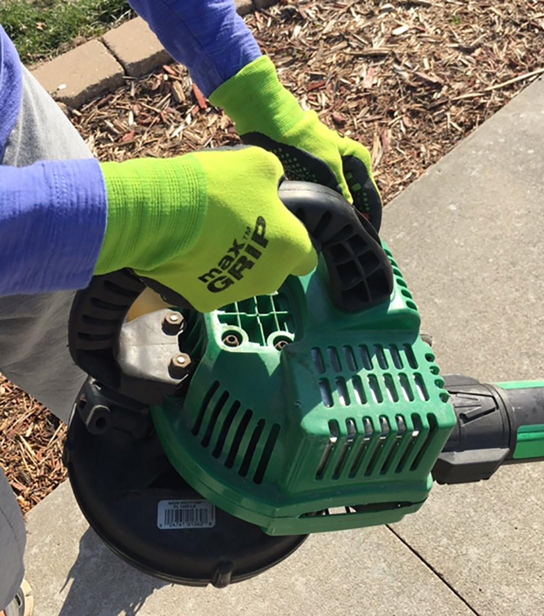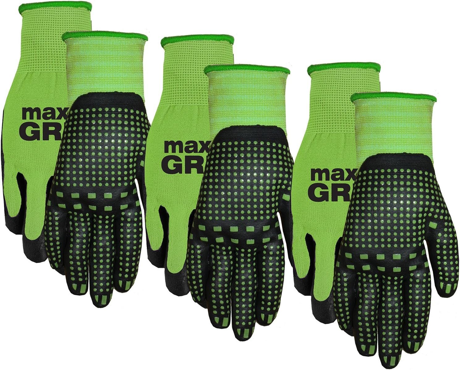 Ladies Max grip gloves in a 3 Pack is the ultimate work glove for all applications for its extra gripping power, puncture & abrasion resistance. The Max grip gloves are a spandex liner dipped in foam nitrile with added green nitrile Dots. Gloves are green.
