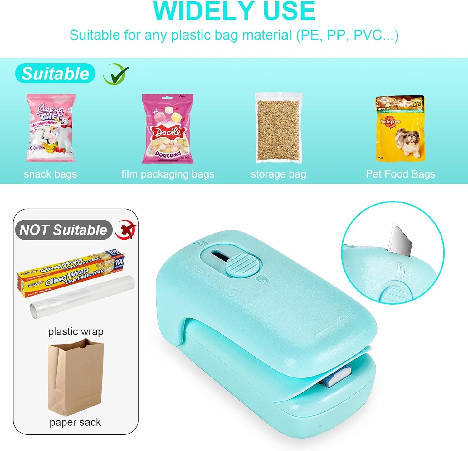 【2 in 1 Bag Sealer & Cutter】 – The mini bag sealer in high-quality ABS material owns a dual-purpose design – the bag sealer heat seal is used to seal the bag, and the blade helps you open the bag. This plastic bag sealer is suitable for PP, PE, PVC bags such as potato chip bags, vacuum sealing bags, cookie bags, pet food bags, etc. In order to ensure its durability, please do not use the mylar bag sealer for plastic wrap, cellophane bags, kraft paper bags, pure aluminum bags.