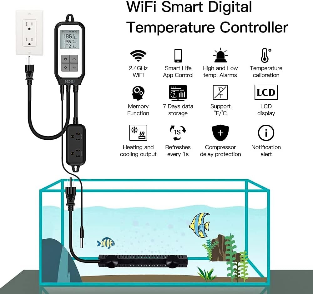 Moes smart temperature controller adopts advanced intelligent temperature control technology, with LCP display, real-time temperature display, high temperature measurement accuracy of the probe, and wide applicability. It can be used for home brewing, breeding, reptiles, chicken incubation, etc.