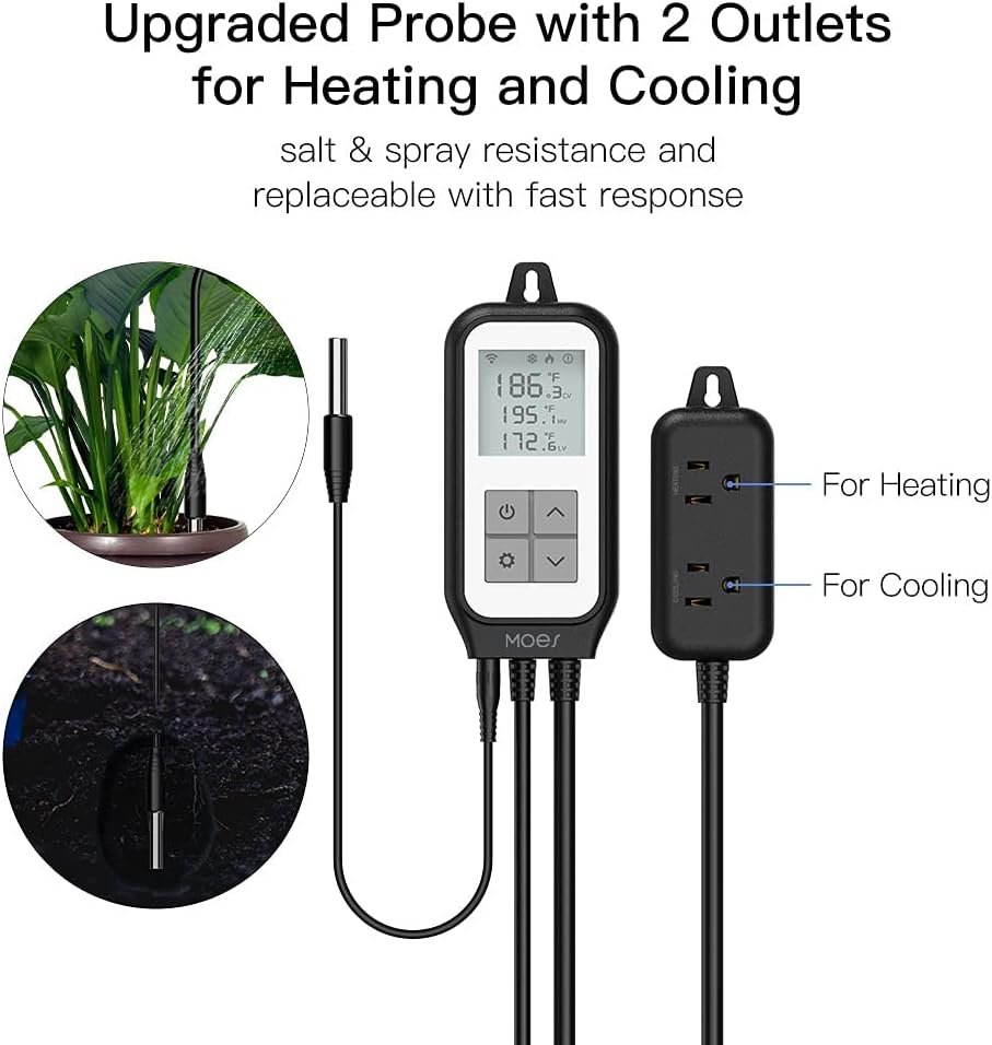 【Easy Install and Use】 WiFi smart digital temperature controller support -22~221℉ / -30~105℃, fits well for extreme temperature in summer or winter; Each thermostat controlled outlet support 10A, 1250W, suitable for main heater and cooler; Ideal for reptile, homebrew, fermentation, breeding, incubation, greenhouse and more with its wide compatibility featured.